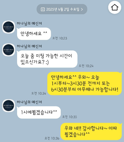 멘토를 보내달라는 기도가 이렇게 이루어졌습니다. 사실 그날은 위에 대화를 나눴던 언니와 약속이 있던 날인데, 언니의 사정으로 날짜가 연기되는 바람에 미팅이 성사될 수 있었어요. 하나님의 타이밍은 정말 완벽합니다!