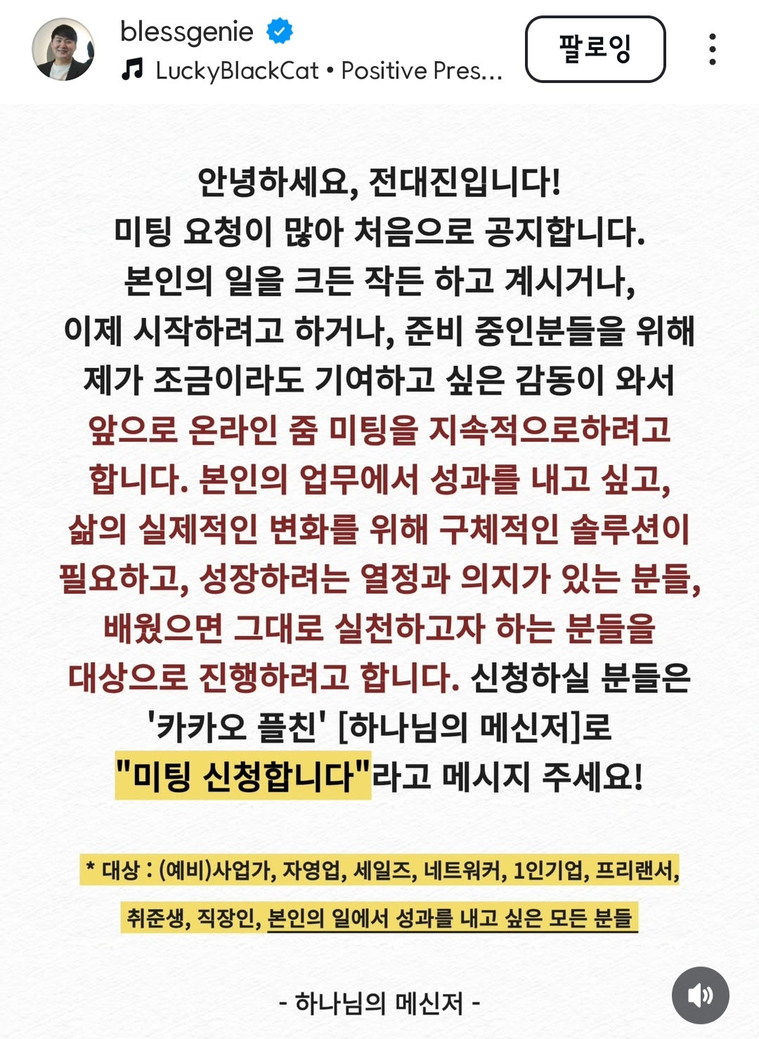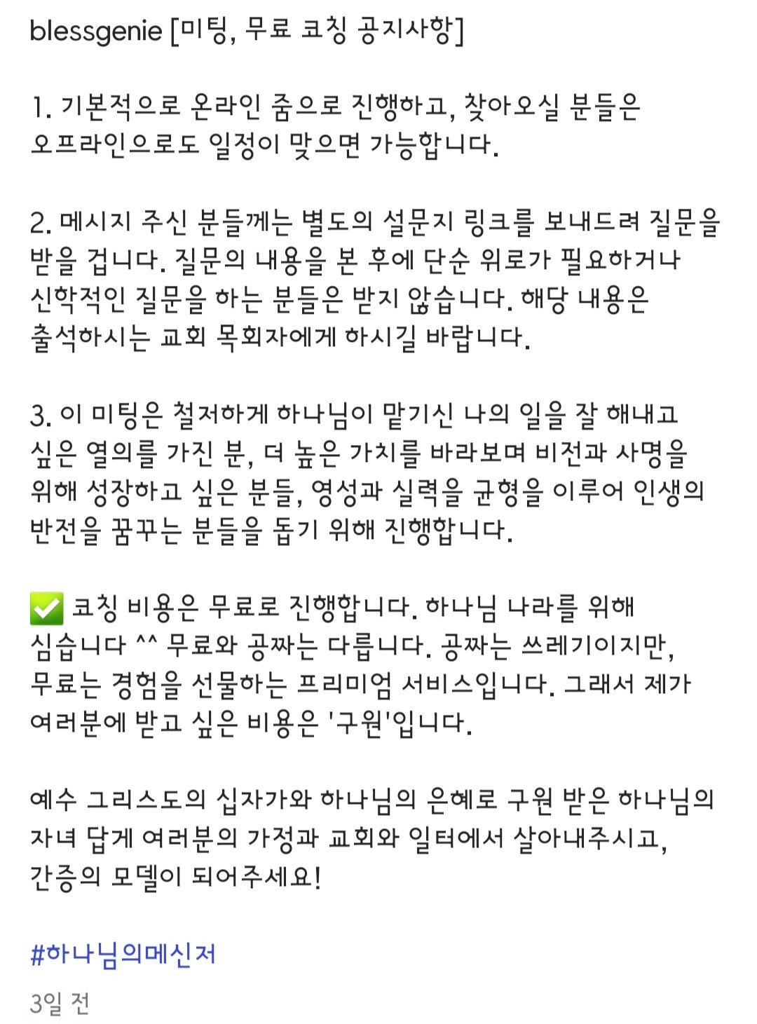 그 이후부터 잘 챙겨 먹고, 책도 읽고, 외국 목사님 설교도 찾아 들으면서 투자한다는 생각으로 운동과 도수치료를 병행하면서 몸과 마음 건강 회복에 집중했습니다. 하나님께서 저에게 주신 은혜가 정말 많은데, 이것들을 어떻게 흘려보내고 펼쳐나갈 수 있을지 고민하며 고군분투하던 중, 누군가가 옆에서 가르쳐주면 정말 좋겠다는 마음이 간절해서 멘토를 보내달라고 기도를 했습니다. 그리고 정말 하나님이 보내주신 선물처럼, 전대진 대표님께서 무료 코칭을 시작하신다는 소식을 접했습니다.
