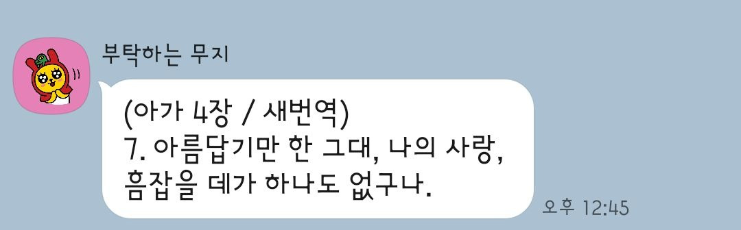 얼마 전까지 심각한 번아웃으로 인한 공허함, 불안정한 수입으로 인한 불안감, 점점 늘어나는 빚에 대한 압박감, 가정 문제로 인한 스트레스, 건강 악화로 인한 각종 병원비 지출로 힘든 시간을 보내며, '왜 이렇게 아등바등 살아야 할까. 이제 그만 삶을 포기하고 싶다.'라는 생각을 했습니다. 스트레스가 많아 예민해지다 보니 부모님께도 말이 곱게 나가지 않았습니다. 밖에서는 사람들에게 칭찬을 받고, 귀한 일을 한다는 말을 듣곤 하지만, 가장 가까운 가족에게는 다정하지 못한 모습이 위선이라는 생각이 들어 죄책감에 시달렸습니다. '하나님 제발 저를 죽여주세요.'하고 울면서 기도했는데 브런치스토리를 통해 알고 지내던 언니에게서 카톡이 왔습니다.
