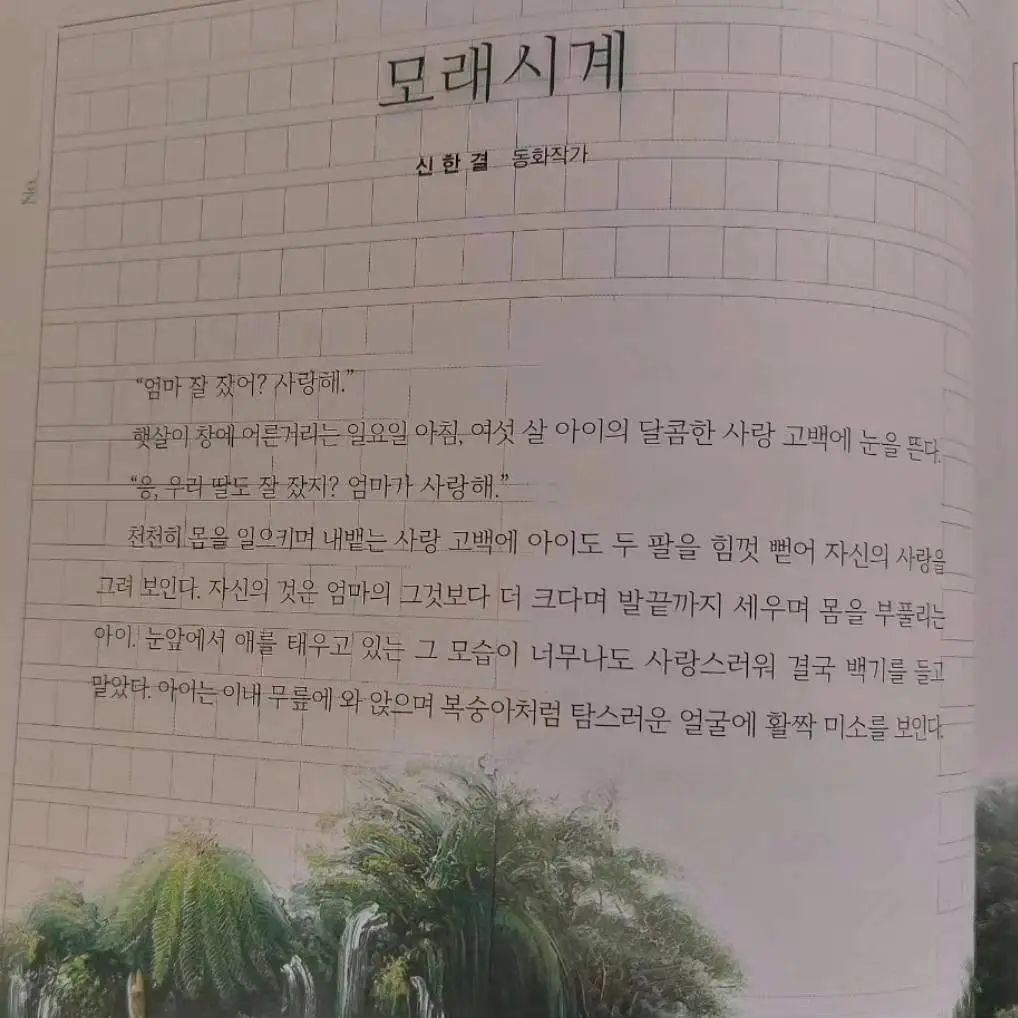 그때부터였을 것이다. 아이의 시간이 달음질치기 시작했다고 느낀 것은. 아이와 나 사이에 보이지 않는 모래시계가 놓인 것 같았다. ‘위에서부터 아래로 떨어지는 고운 모래들은 잠시의 주저함도 없이 아래로 쏟아지다 결국 그 시간을 다하곤 하는데… 아이가 뿜어내는 완전한 사랑 또한 그 끝에 다다라 멈추게 되는 날이 오겠지…’라는 생각이 들어 조바심이 나기 시작했다. 품 안의 아이는 곧 소녀가 되고 독립적인 인격을 갖추게 될 테니까. 꼭 엄마만큼의 세상 안에서 자라던 아이는 그보다 더 큰 세상을 궁금해하며 좀 더 자주 바깥을 내다보게 될 것이다. 그때가 되면 아이의 세상에서 변방으로 밀려난 내가 지금 이 순간을 몹시도 그리워 할거라는 생각에 쓸쓸함과 아쉬움이 동시에 밀려왔다.