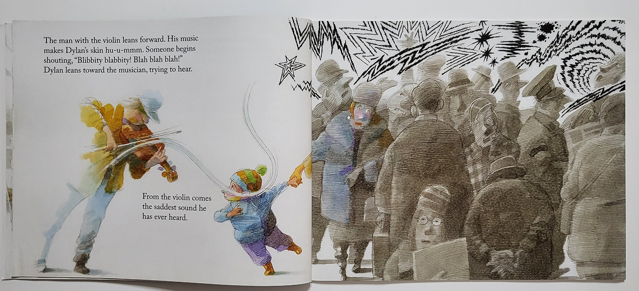그렇게 아이는 멀리서부터 들려오는 바이올린 선율의 움직임을 보고 듣습니다. 단조로운 흑백의 세상을 사는 어른들은 인식하지도, 기억하지도 못할 아름다운 순간을요.