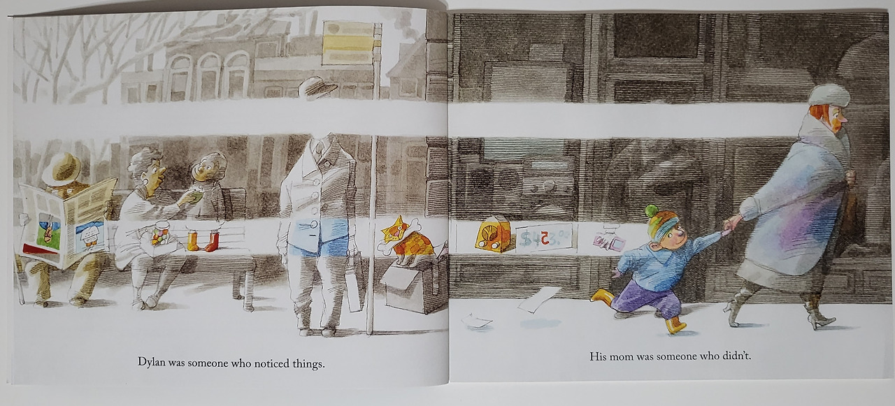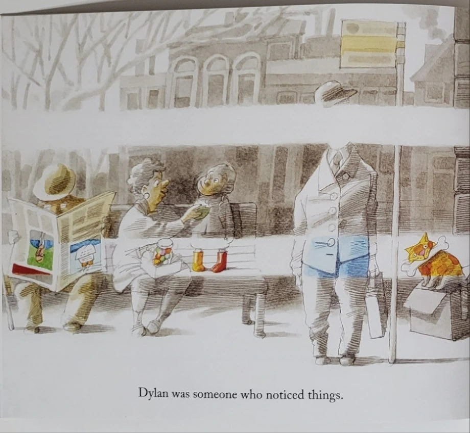 반면, 자신보다 덩치가 두 배는 더 큰 엄마의 손에 질질 끌려가면서도 딜런은 신이 나 죽겠는 표정입니다. 신문을 거꾸로 든 할아버지, 양쪽 발에 다른 색의 장화를 신은 또래 아이, 물고기대신 뼈다귀를 물고 있는 고양이라니... 끽끽 대며 웃을 만한 그 모든 것들이 아이의 시선을 사로잡습니다. 세상의 재미난 모든 것을 기억에, 마음에 담기에 아이의 하루는 다채롭고 풍요로울 수밖에 없어요. 아직 '세상을 느끼는 감각'을 잃지 않았거든요.