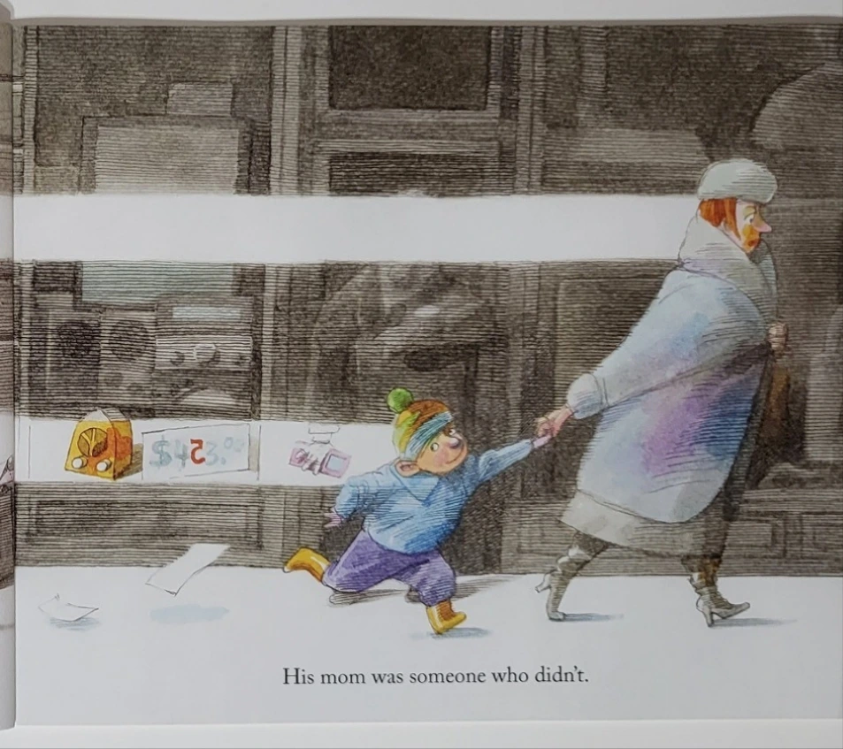 엄마의 손에 이끌려 어디론가 가고 있는 아이가 보이시죠? 무미건조하게 굳은 엄마의 표정도요. 처음 이 책을 펼쳤을 땐 단순히 전체적인 그림과 글자를 읽는데 정신이 팔려있었어요. 양쪽 페이지에 짧게 적혀있는 두 문장을 지나 곧장 다음 페이지로 달려갔죠. 이야기의 전개가 너무 궁금했거든요.