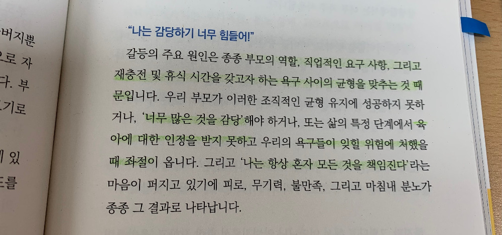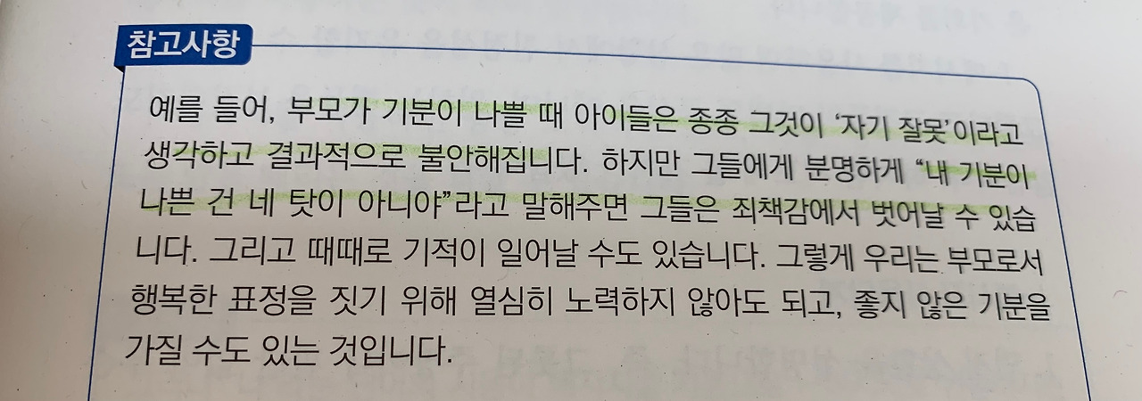 많이 공감이 되는 부분이었다. 나 역시도 어린 시절 부모님의 갈등이나 가족 내 문제가 생겼을 때 쉽게 나를 탓했던 부모님에 대해 억울했던 마음에 커서도 나와 상관없는 주변의 갈등에 마음이 쉽게 불편해짐을 느낄 때가 있었기 때문이다. 가족의 갈등으로 인해 아이가 불편해지거나 오해할 수 있는 상황에서 아이가 죄책감에서 벗어날 수 있도록 부모로서 잘 살펴야 할 것이다.