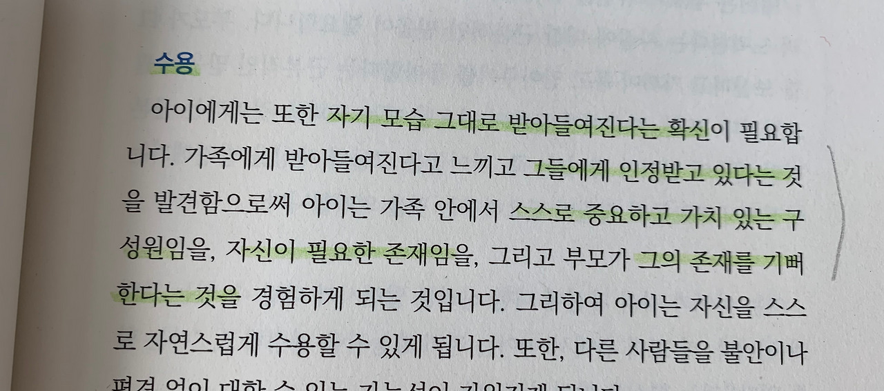 이 문장을 읽는 순간 내 안의 어린아이에게 필요했던 결핍의 조각을 찾은 기분이었다. 늘 무언가를 잘해야 수용받고 인정받고 존재의 의미가 있다고 생각했기에 늘 나의 좋고 나쁨은 부모님의 평가에 의해 좌우되었다. 그래서 나 자신과 부모님의 사랑은 바람 앞의 작은 촛불처럼 불안했던 것 같다. 하지만 이 책을 읽으면서 완벽할 수 없었을 부모에 대한 이해와 이미 성인으로 성장해 버린 나에게 이제는 내가 나 자신의 부모가 되어 조건 없는 수용의 경험을 채워주어야겠다고 다짐한다.