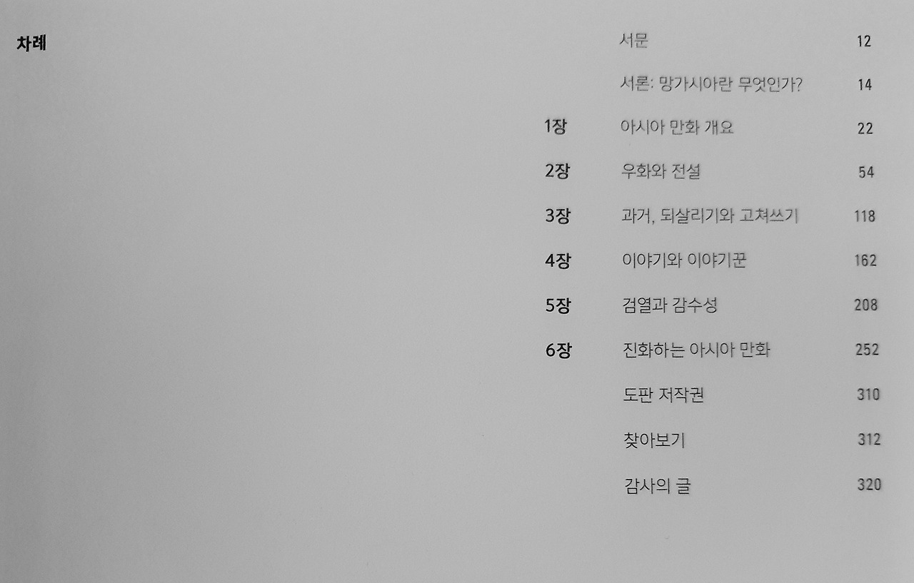 <망가시아>의 간결한 목차. 수많은 이미지 자료가 돋보이는 서적이지만, 내용 또한 아시아 만화에 대한 이해도를 높여주기에 충분합니다.