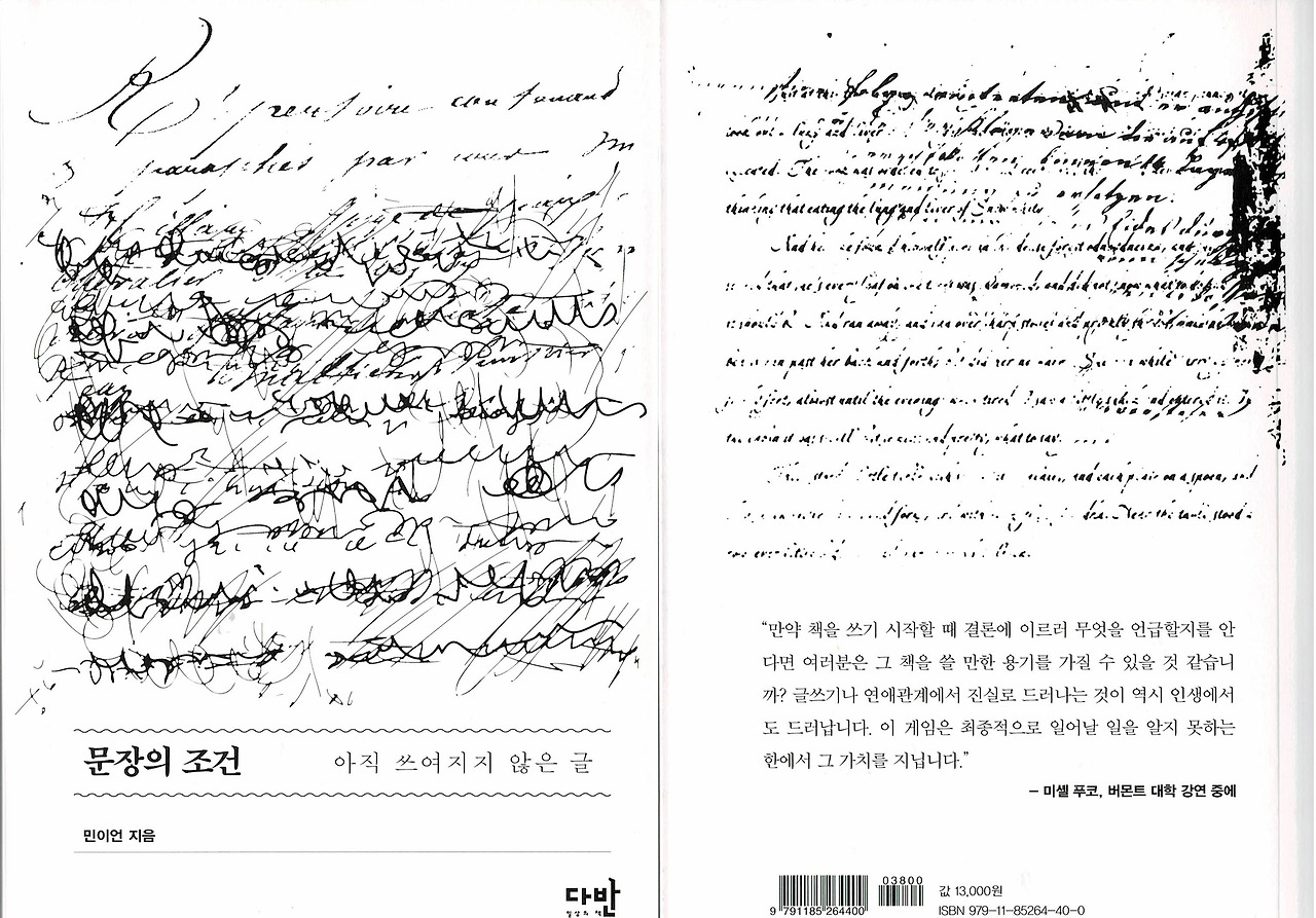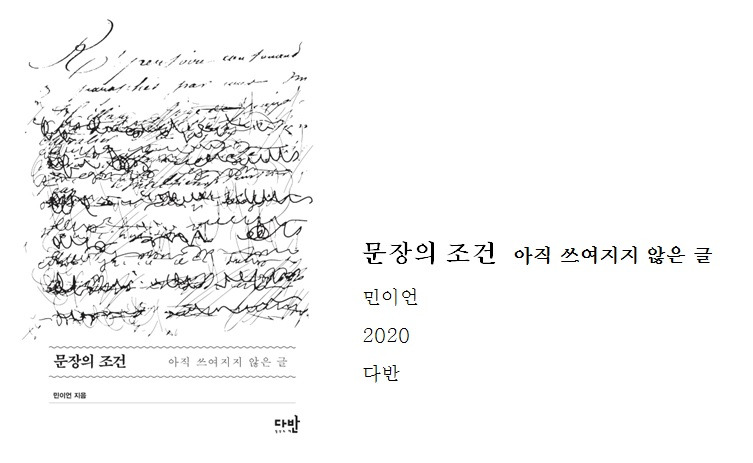 민이언이 펴낸 <문장의 조건_아직 쓰여지지 않은 글>은 시대를 풍미한 사상가들의 글쓰기에 관한 어록을 바탕으로, ‘글쓰기의 의미’를 좇는 에세이입니다(저는 작가 민이언의 에세이로 느꼈는데, 독자에 따라 다르게 인식할 수도 있을 것 같습니다). 문학과 철학 대가들이 글쓰기에 어떤 인식을 지녔는지를 어록을 통해, 또 저자의 고찰을 통해 느낄 수 있습니다.