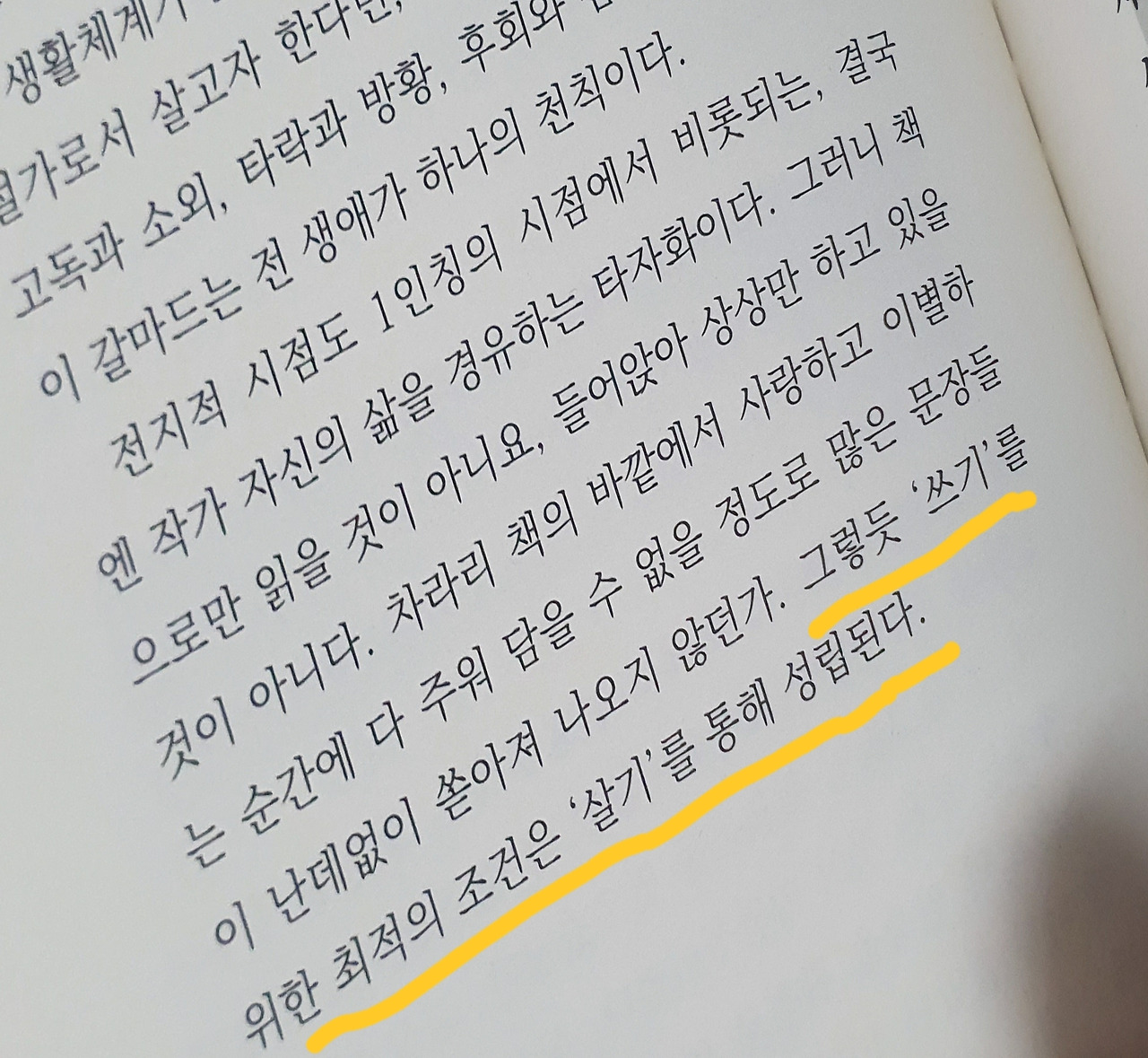 '살기'를 통해 '쓰기'를 위한 최적의 조건이 성립된다는 것. 참 와 닿았던 표현인데, 정말 어려운 과제입니다.