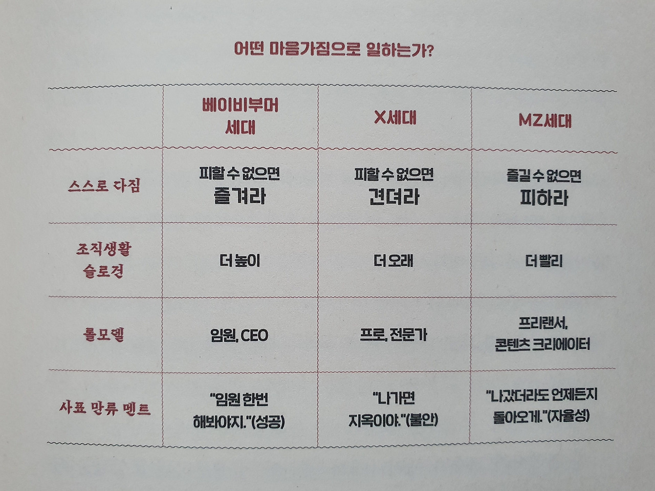 마음가짐이 다른 세 세대. 조화가 참 어려워 보이지만, 공존의 양지는 분명 있을 것입니다(p.29 표).