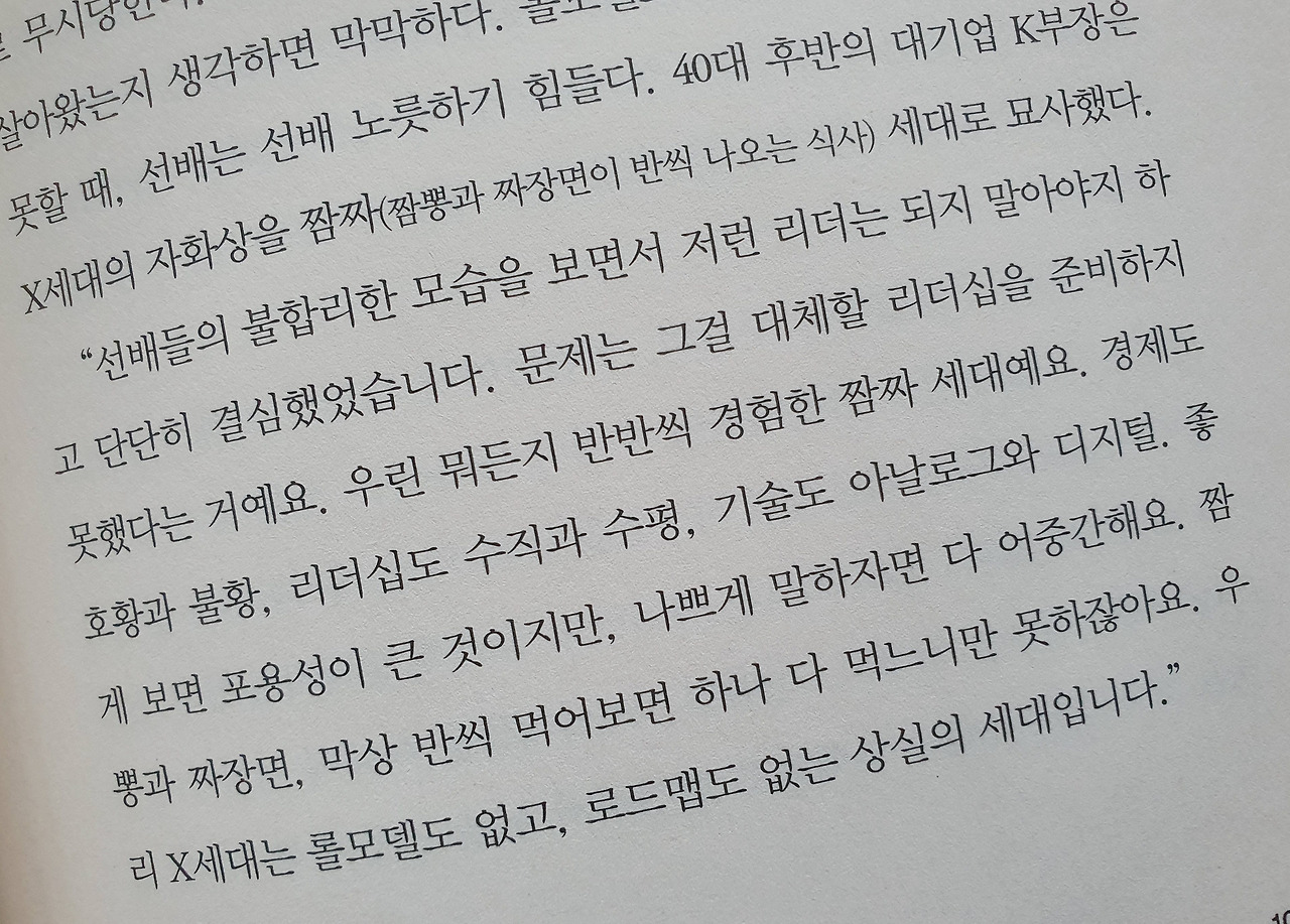 특히 회사의 주축(이라고 하기엔 다소 노쇠해진) X세대가 잡식동물이 아닌, 덩치에 맞지 않게 풀만 뜯는 소에 비유되는 것은 이 시대 설 곳 없는 낀 세대의 현주소가 아닌가 싶기도 합니다(자꾸 동질감을 느끼네요~).