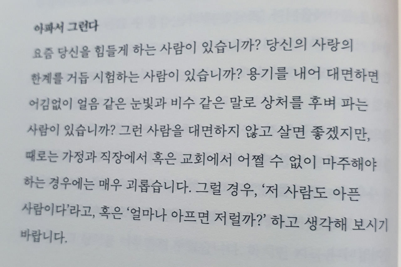 나를 힘들게 하는 사람에 대해 “그 사람이 아파서 그런다”라고 한 부분이 인상적입니다. 내 아픔에 집중하다 보면 나를 이렇게 만든 문제의 원인으로만 상대를 평가하지, 그의 상처를 보기는 힘듭니다. 어쩌면 저도 ‘내가 아프다’는 이유로, 제 아픔은 감춘 채 다른 누군가에게 상처를 주는지 모릅니다(아니, 확실히 줍니다!).
