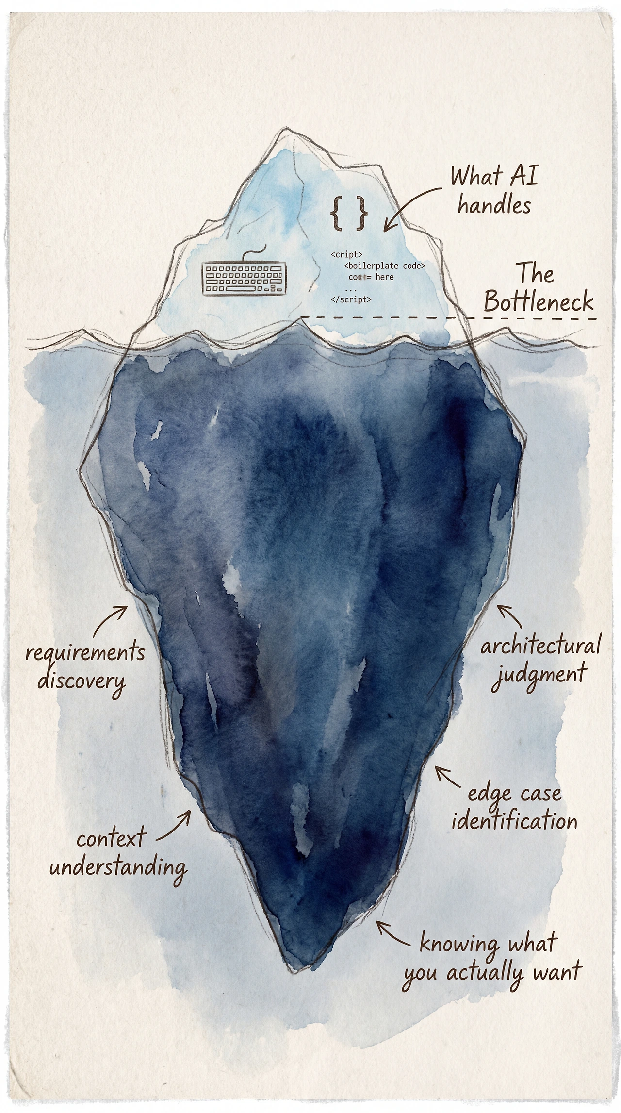 앞서 언급한 의도 격차가 바로 이것입니다. 우리가 알고 있는 것과 표현할 수 있는 것 사이의 차이를 말합니다. 머릿속의 모호한 생각을 명시적인 명세로 변환하는 것이 이제 병목이 된 것입니다. 코딩 자체가 아니라요.