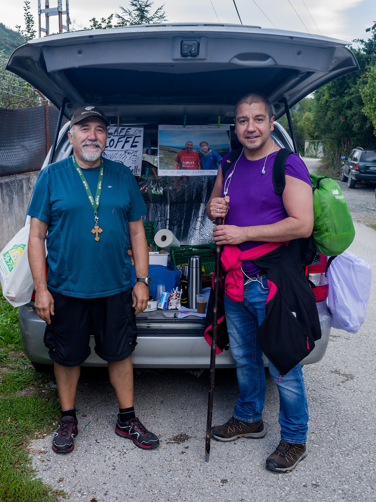 수비리에서 처음 만나 걸으며 종종 인사를 나눴던 친구(오른쪽)다. 차림새부터 로컬의 냄새를 풍긴다. 내가 드라이핏 티셔츠와 등산바지, 패딩 등을 준비한 것과 달리 이 친구는 티셔츠에 청바지를 입고 걸었다. 스틱도 없이 걷다가 어느 마을 상점에서 지팡이를 팔길래 하나 샀다고. 가방은 봇짐처럼 든 게 거의 없다. 대학생 때 내 친구가 저런 차림으로 풋살장에 갔다. 가방에 축구화와 반바지 정도 집어넣어서.