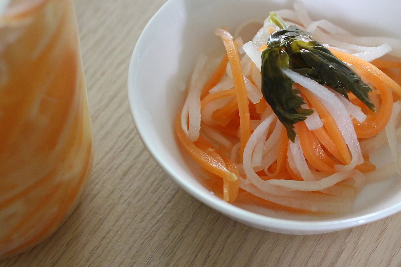 식초 절임은 말 그대로 채소를 식초에 절이는 것이다. 이 역시 채소를 소금에 살짝 절이는 것부터 시작한다. 그다음 절임물을 만든다. 피클과 다르게 밥반찬용이니 물양을 넉넉하게 잡고 설탕을 줄이는 게 좋다. 내 경우 3:2:1 정도로 잡는다. 물 300ml에 식초 200ml, 설탕 100ml 이내로. 여기에 다시마 두 어 장 더하면 감칠맛이 살아난다. 절임물 팔팔 끓여 채소에 부으면 완성.