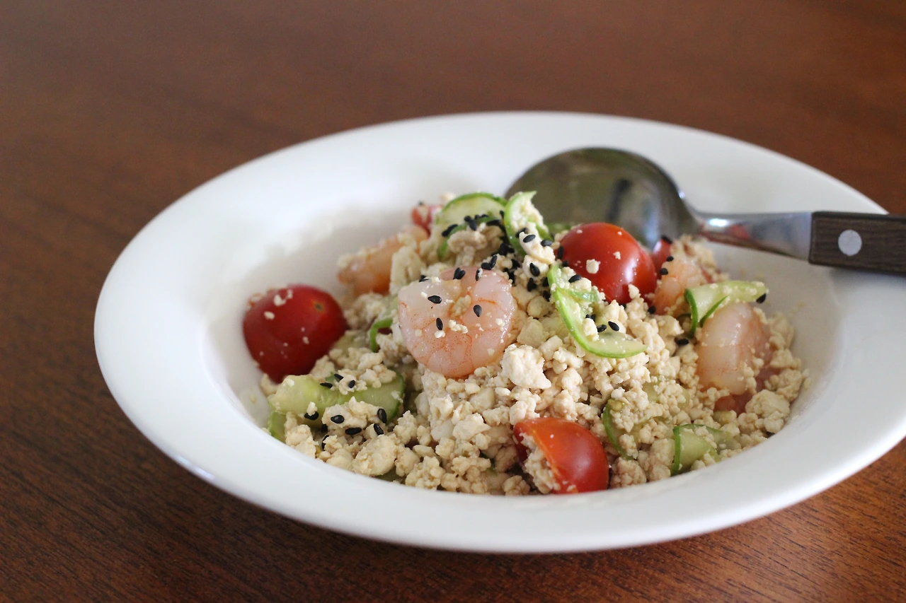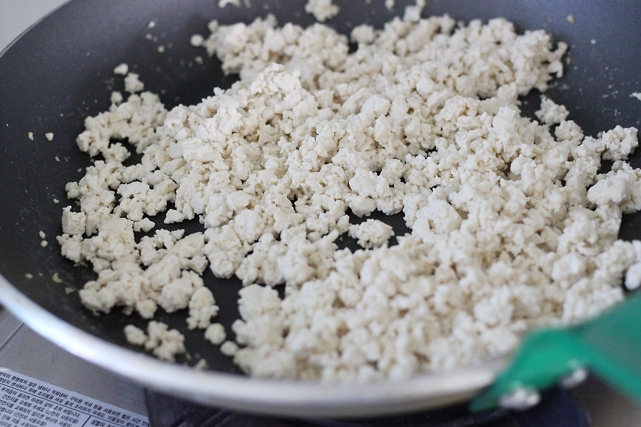 개인적으로 밥이랑 가장 비슷한 베지라이스라면 역시 두부 크럼블(crumble)을 꼽겠다. 만드는 법 또한 다른 베지라이스보다 훨씬 더 간단하다. 그저 마른 팬에 두부 한 모 올려 약불에 으깨 가면서 볶기만 하면 된다. 수분이 어느 정도 날아가 두부가 노르스름해지면 완성. 고소한 풍미며 부드러운 식감까지 흰쌀밥과 유사해 이질감이 전혀 들지 않는다. 그저 밥 대신해 밑반찬에다 밥 대신 먹어도 간편하지만 유부초밥의 속으로 채워도 좋고 샐러드에 더 해도 맛있다.