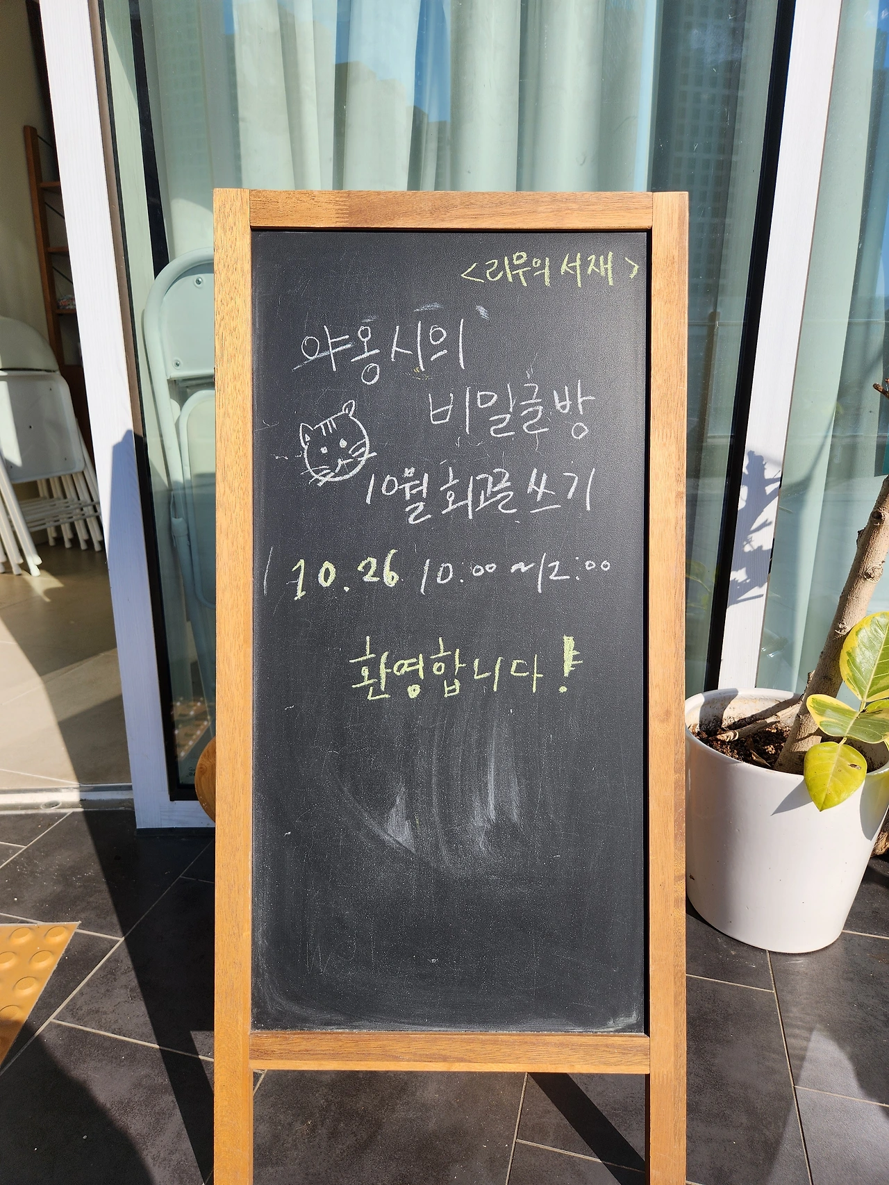 10월 모임 간판을 쓰고 있을 때 회원 J님이 방문해 주셨어요. J님은 가장 먼 곳에서 야옹글방을 찾아주시는 회원이에요. J님이 들고 오신 10월에는 가족에 관한 고민이 담겨있었어요. '나는 행복한가?' 라는 제목의 글이었습니다. 1년 중 가장 좋아하는 계절인 가을에 가족 모임에서 있었던 일에서 시작하여 행복에 대한 고민까지 이어지는 내용이었어요.