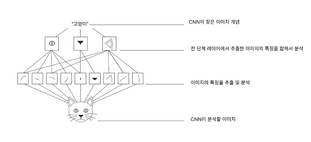CNN은 시각 데이터를 처리하는데 특화되었다. 사람의 시각 정보 처리 방식을 비슷하게 모사하는 인공지능이다. 사람은 시각적인 정보를 인지할 때, 형태의 작은 단위의 특징부터 점차적으로 복잡한 시각 정보를 인식하는 단계를 거쳐서 사물을 인지한다.