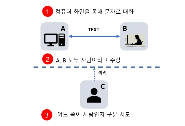 심판은 답변을 보고 누가 사람인지 맞춰야 합니다. 만약에 인공지능이 너무 자연스럽게 대답해서 심판이 헷갈렸다면 ‘인공지능은 사람처럼 생각하는 것처럼 보인다.‘고 확인할 수 있습니다.