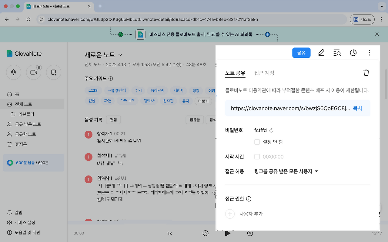 회의록을 이메일을 통해서 다른사람들과 공유가 가능합니다. 접근 권한 설정과 비밀번호 설정도 가능해요.