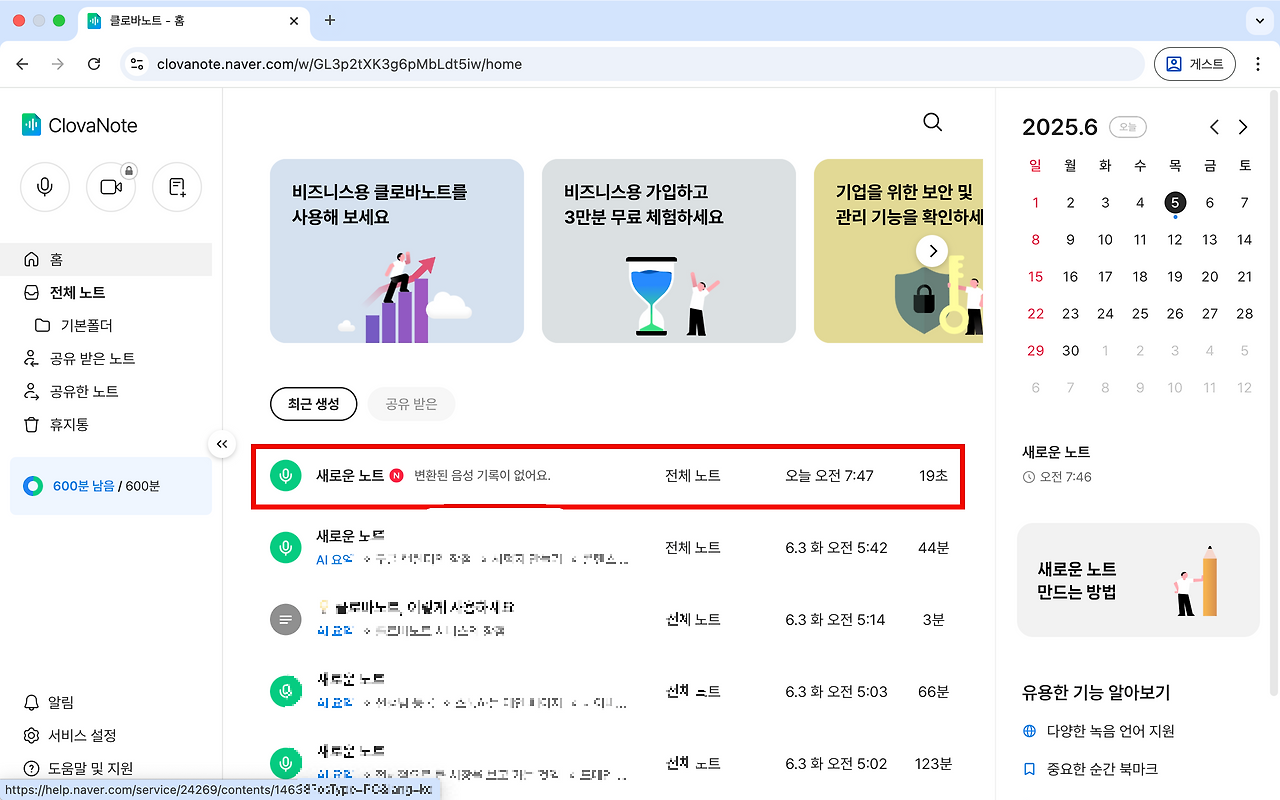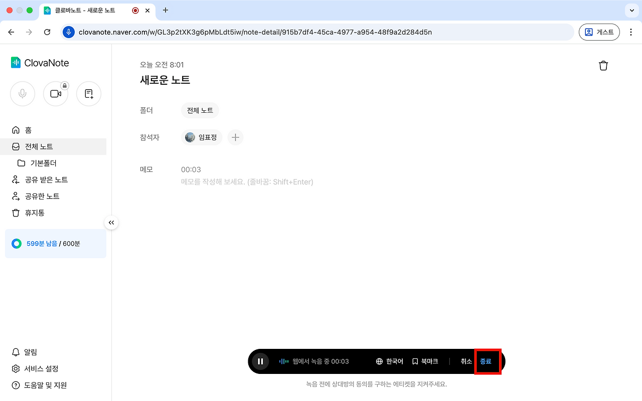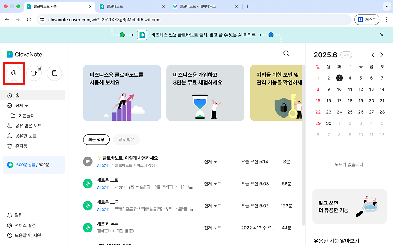 로그인 후에 왼쪽 상단에 마이크 버튼을 클릭하면 녹음을 시작해요.