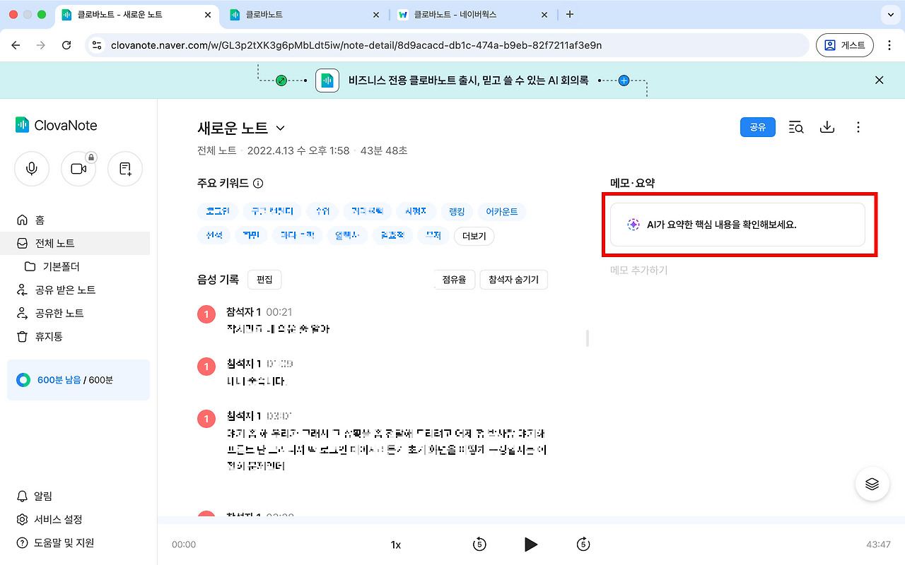 AI요약버튼을 쿨릭하면 회의 전체내용을
