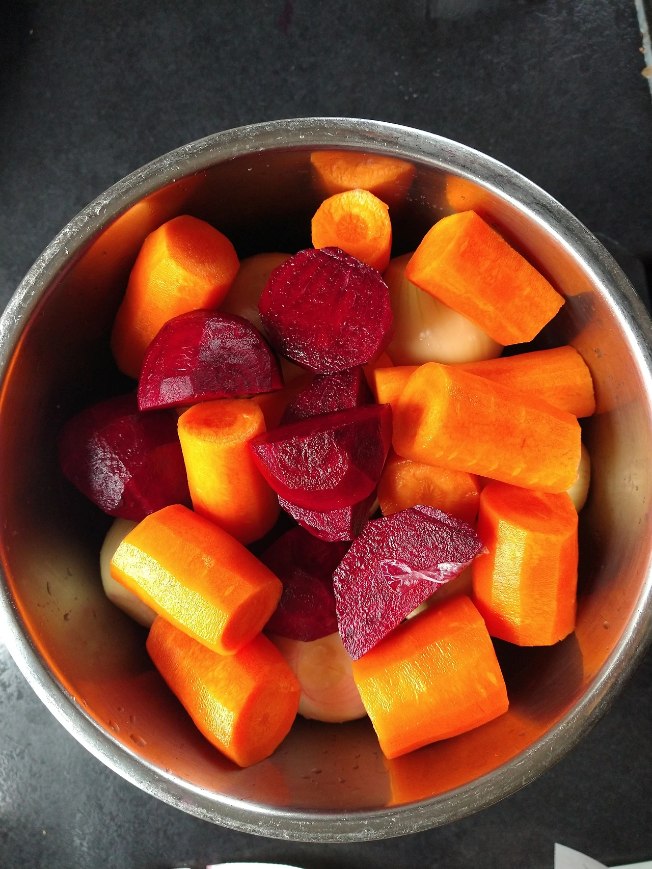 * 양파는 통으로, 당근은 블렌더에 넣기 좋은 크기로 자르고, 비트도 당근과 비슷한 크기로 잘라 인스턴트팟에서 6분 정도 찐다. 양파가 너무 푹 익으면 흐물흐물거리고 또 설익으면 양파 냄새가 강하기 때문에 적당하게 익혀줄 필요가 있다. 인스턴트 팟에 6분 스팀기능으로 하니 아주 딱 적당하다.