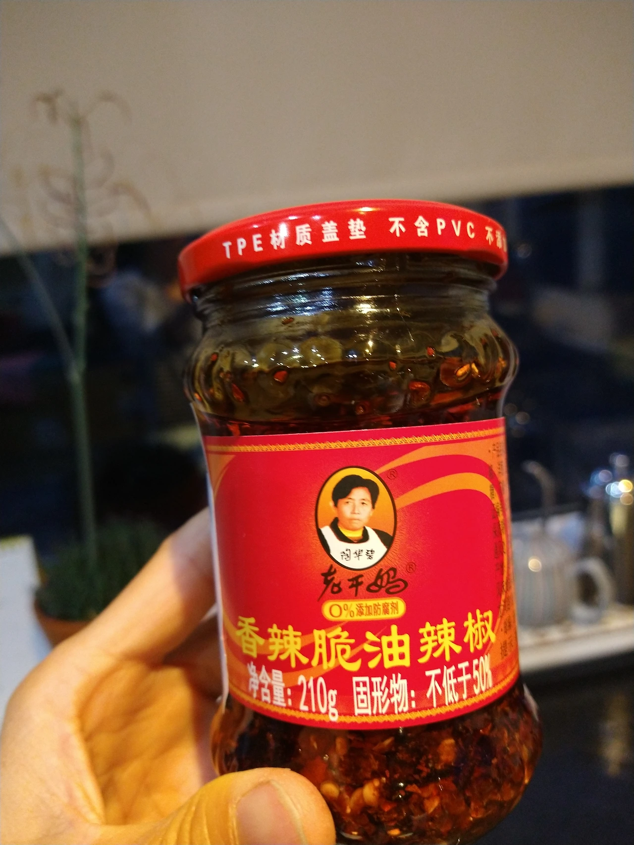 얼마 전에 호주에 사는 일본 요리사가 라오간마칠리오일을 넣는 것을 보고 시내 아시안마트에 가서 공수해다 넣어봤는데 세상에!!!!!! 이거 몰랐으면 어쩔 뻔했나 할 정도로 감칠맛(msg가 들어가 있음)이 장난이 아니다. 게다가 중국 사천고추가 조금 들어가 아주 맵지는 않지만 혀를 자극하면서 튀긴 대두와 바삭한 고춧가루가 아주 볶음면을 한 층 업그레이드 시켜주는 최상의 식자재이다. 볶음밥에도 마찬가지로 넣어서 볶아 먹으면 정말 맛있다.