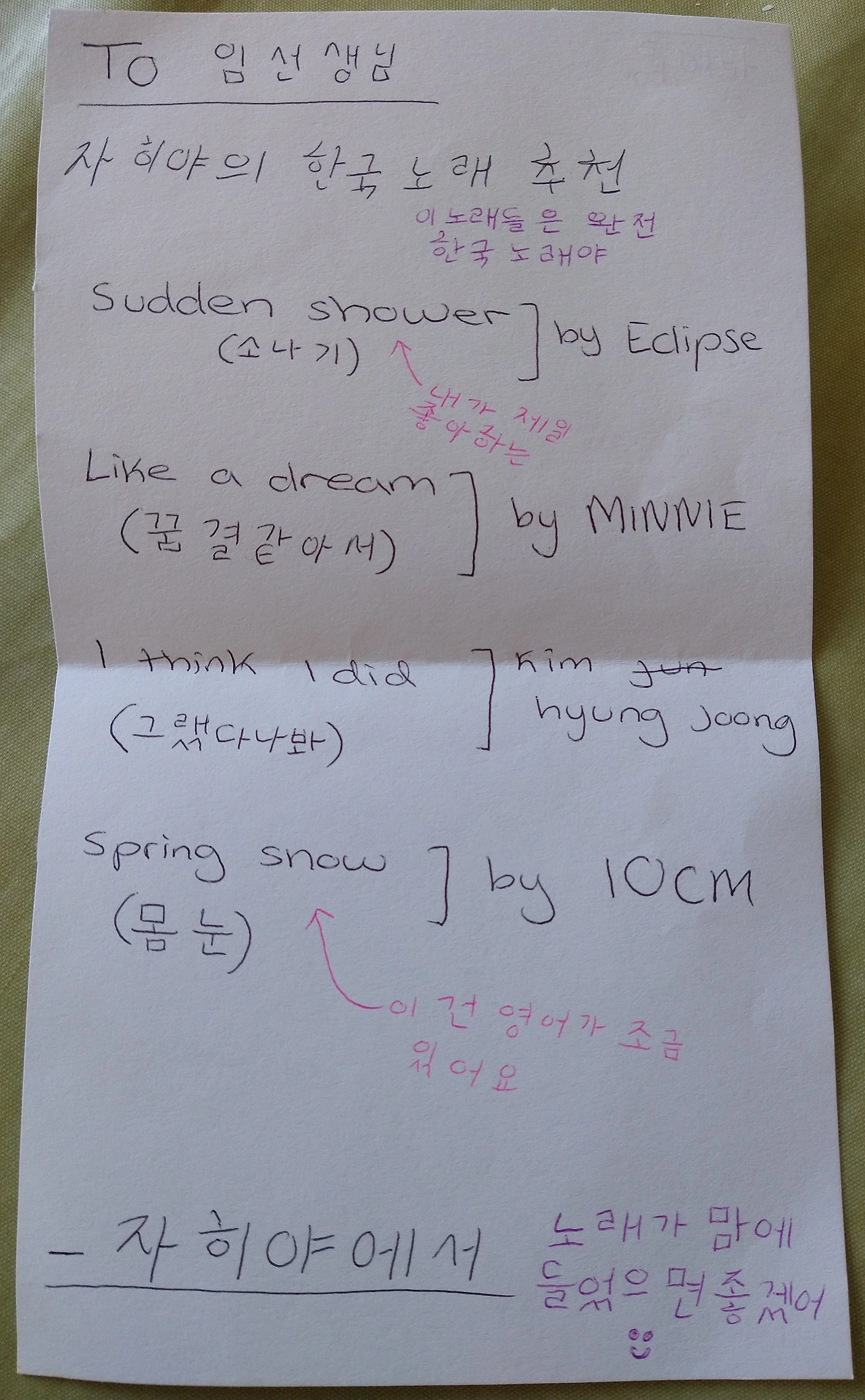편지를 열어보니 반말과 존댓말이 어색하게 섞여있었다. 그래도 혼자서 배운 한국어로 이렇게 나에게 편지를 써주는 정성과 노력에 감동을 하고 말았다.