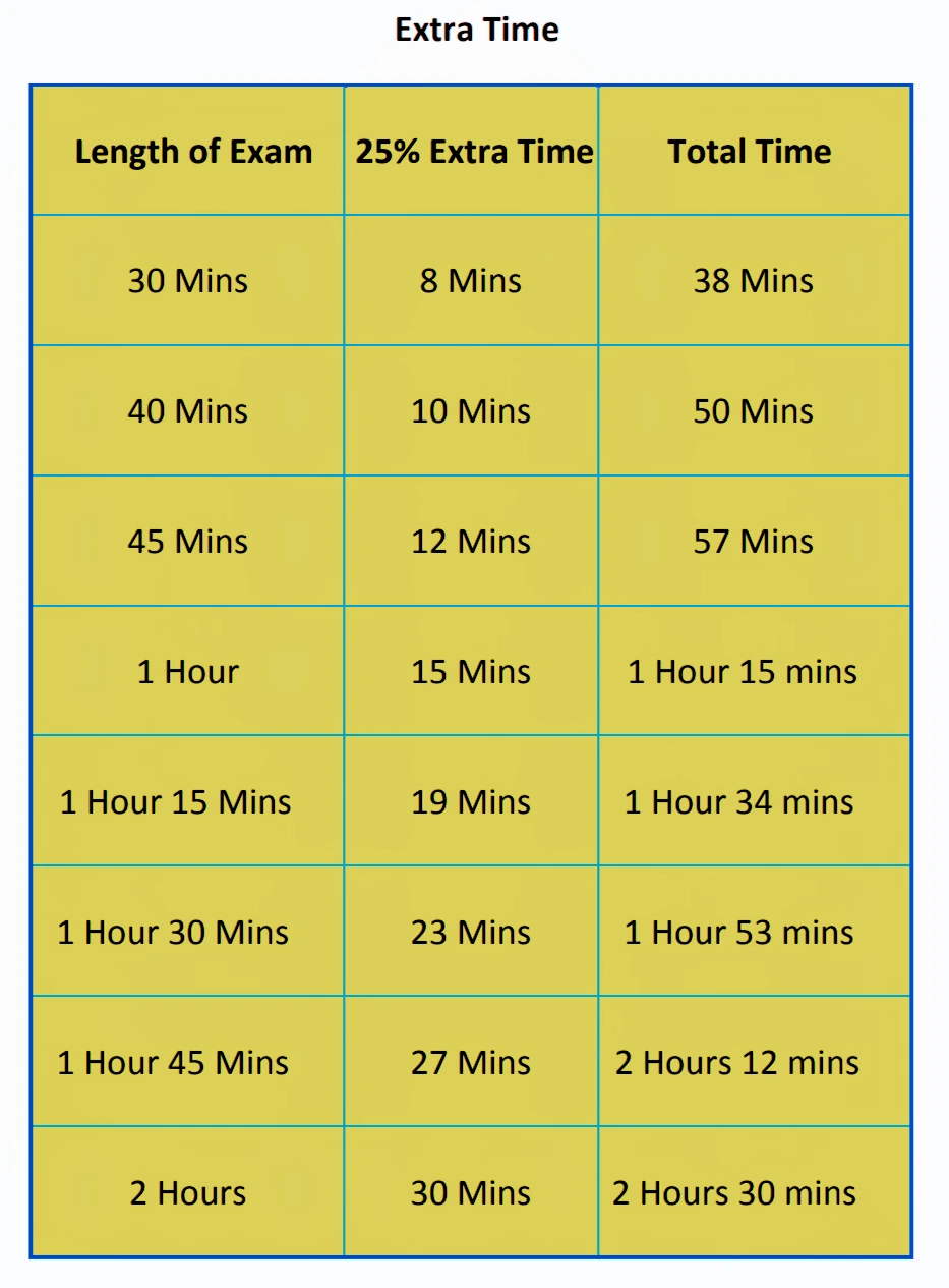 그곳에서 흥미로운 것을 발견했다. 바로 extra time이 퍼센트 별로 계산된 종이 한 장이다. 학생들의 난독증 정도와 심리적인 이유로 시간이 더 필요한 학생들은 학교에서 별도의 절차를 거쳐 추가 시간을 줄지 미리 정해놓고 시험 배치도에도 표시를 한다. 대부분은 주어진 시험 시간의 25%를 추가로 준다. 1시간 시험이라면 15분의 추가 시간이 주어진다. 50%가 주어지는 경우도 흔하진 않지만 가끔 있다. 추가 시간을 쓰는 학생들은 강당의 맨 뒤에 따로 배치하고 책상 위에 시험 시작 시간과 추가 시간에 대한 기록을 할 수 있는 카드를 별도로 올려놓는다. 추가 시간을 준다고 해도 다 쓰지 않고 시험 시간에 맞춰 끝낼 수도 있다. 시험을 마치고 싶으면 언제든지 손을 들어 알리면 감독관이 그 학생에게로 가서 미리 올려놓은 카드에 시험 종료시간을 기록하고 학생이 서명하게 한 뒤 시험지를 걷어온다. 그래서 시험은 늘 주어진 시간보다 더 걸리며 다음 시험을 바로바로 배치하지 않고 중간중간 여유시간을 충분히 두고 시간표를 짠다. 보통 강당에 100명 이상이 시험을 볼 때 Extra Timer들은 많게는 20명에서 적게는 10명 정도 된다.