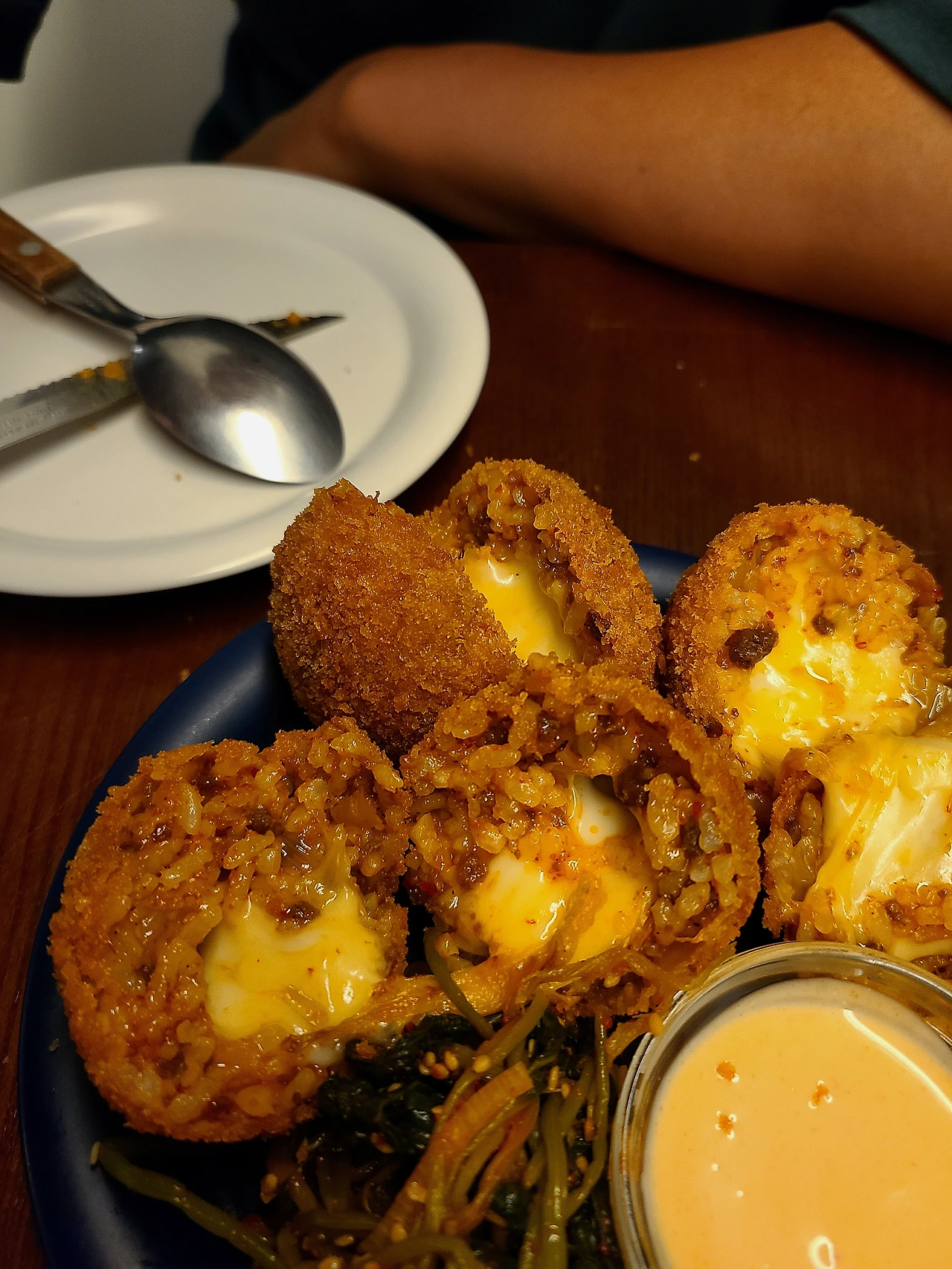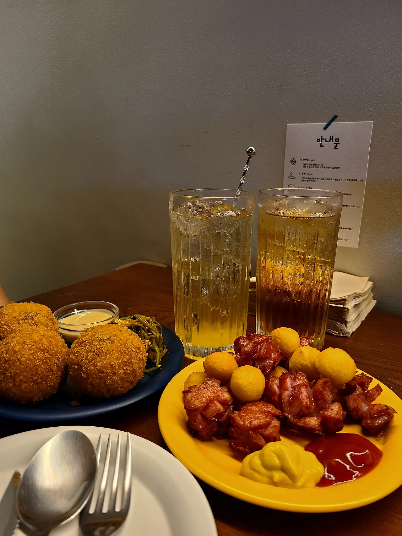 혹여 양이 적더라고 다양한 메뉴를 조금씩 맛보는 게 훨씬 좋은 J와 나는 주문한 안주가 소인(小人) 양이어도 상관없겠다고 생각하며 아란치니와 소시지 감자볼, 라구볶이를 주문한다.