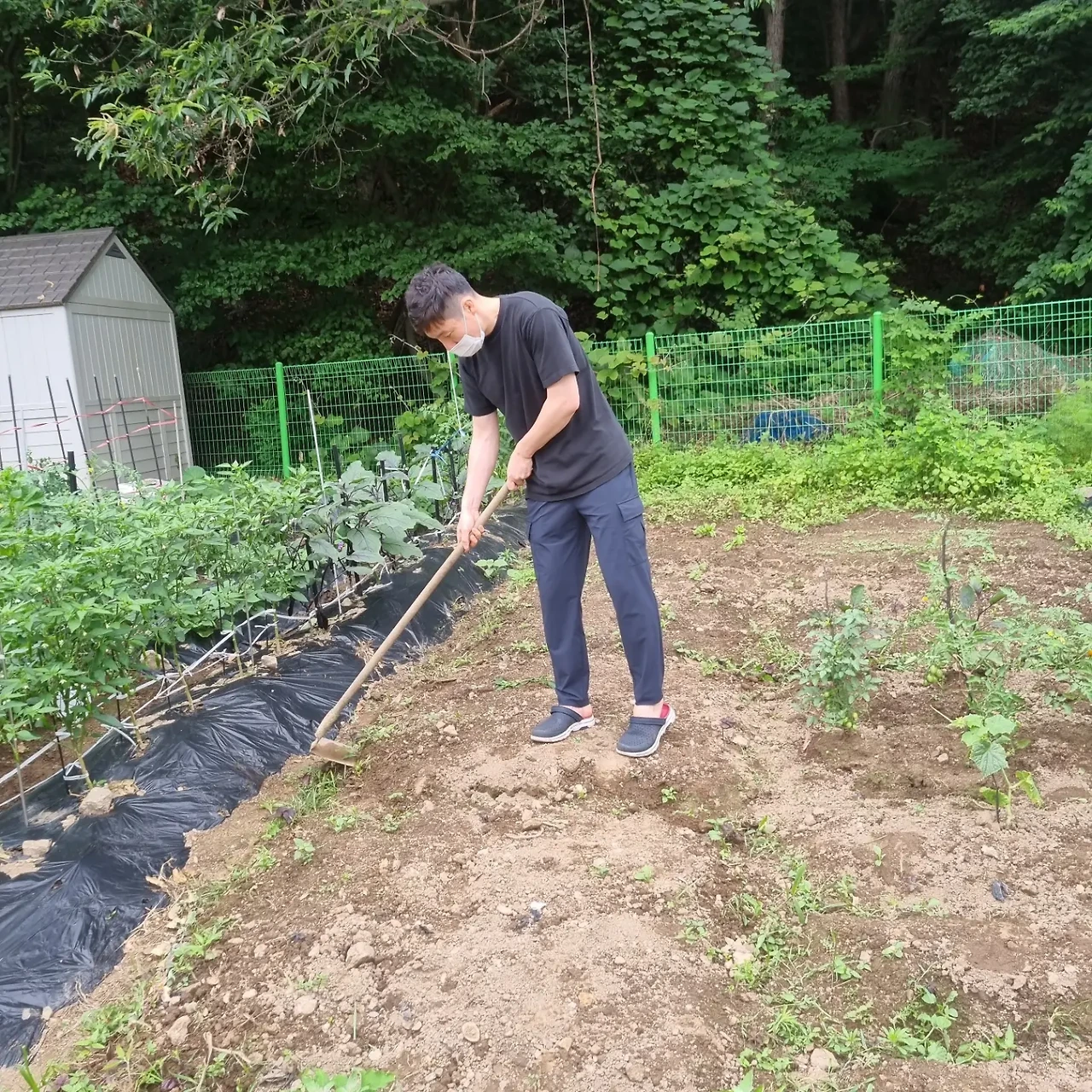 내 텃밭을 사진으로만 보고, 내가 따온 방울토마토를 먹어보기만 하던 남편이 주말 텃밭 가는 길에 따라 나섰다. 농기구를 가져오라고 하더니 곡괭이로 한 15분? 잔소리를 해 가며 잡초를 정리해 주었다. 군대에서 해봤다나...한국 군대에서는 정말 많은걸 하는 것 같다. 소가 필요하다고 했더니 남편소가 와줬다.