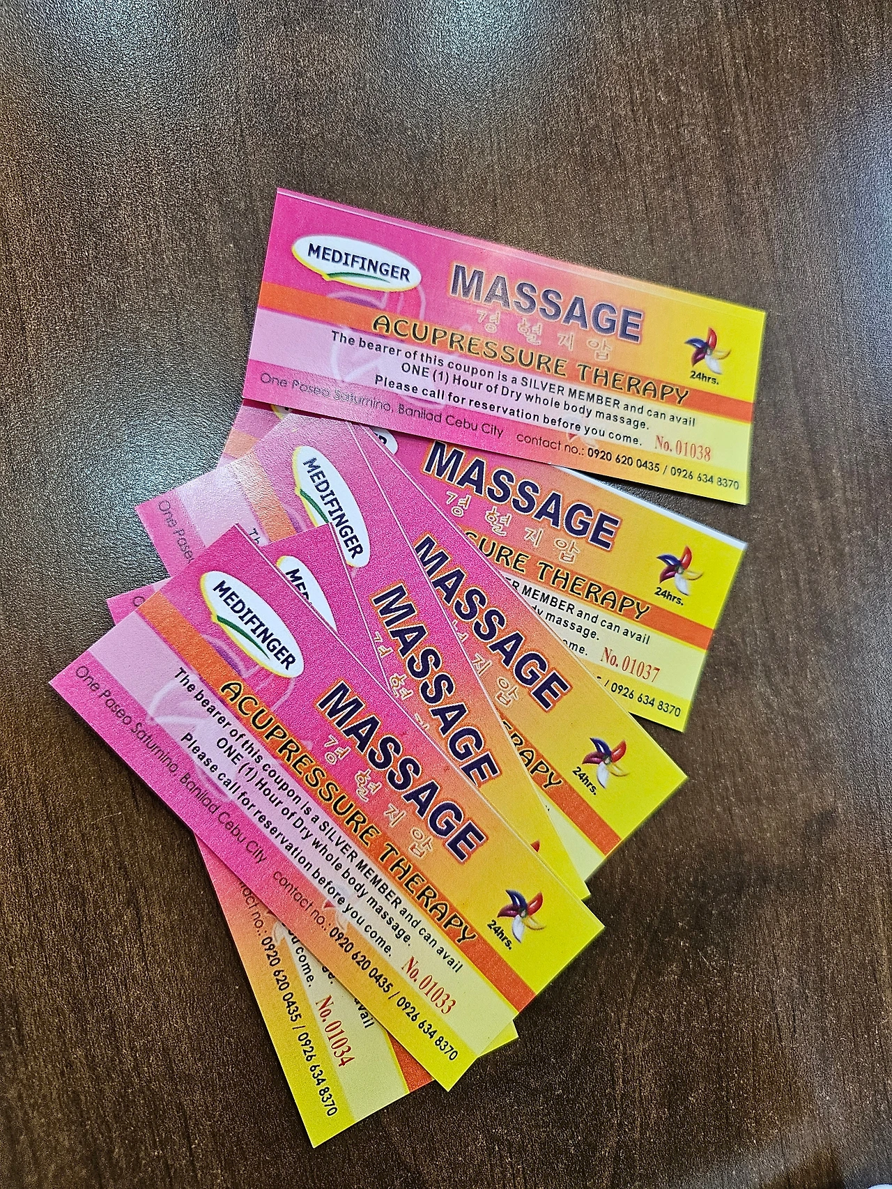 며칠 지나지 않아 마주칠 때마다 인사와 스몰톡을 나누던 어머님께서 마사지 티켓 공구에 함께하지 않겠냐고 물어봐주셨다. 안 그래도 세부까지 와서 마사지는 꼭 받고가야지 하고 벼르고 있던 차에 너무나 반가웠다. 마사지 티켓 30장을 한꺼번에 사면 할인된 가격에 살 수 있기 때문에 여러 명이 돈을 모아 사서 나누는 것이다. 덕분에 저렴한 가격에 마사지 티켓 8장을 구매할 수 있었고, 그 이후로도 수영장에서 또는 로비에서 마주치고 대화를 나누면서 친해져 함께 여행도 떠날 수 있었다. 사실 나는 계획적인 사람이 아니라 주말에 어디를 가야 할지, 어떤 여행이 좋을지 전혀 알아보지 않은 상태에서 왔는데 이미 이 곳에 몇 달째 체류하던 분들께서 알아서 척척 데려가 주시고 저렴한 패키지도 소개해 주시니 그야말로 황송할 지경이었다.