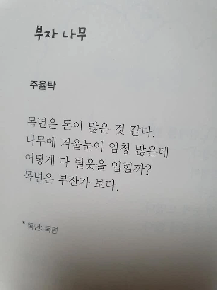 유추해보건대 시 내용처럼 시인은 만사가 귀찮았던 걸로 보인다. 아무것도 안 하고 싶은데 선생님이 시를 써서 가져오라고 숙제를 냈을 것이다. 정말 아무것도 하고 싶지 않았던 시인은 시를 쓰는 일이 죽을 맛이었을 것이다. 그래서 있는 그대로 진솔하게 아무것도 안 하고 싶은 마음을 고스란히 함축하고 압축해서 단 한 줄짜리 시를 완성했으리라. 선생님도 시인의 시를 본 순간 나처럼 깜놀했을 것이다. ‘나와 나타샤와 흰 당나귀’를 쓴 백석 시인이나 ‘향수’를 쓴 정지용 시인을 떠올렸을지도 모른다. 그녀의 선생님은 백지나 다름없는 극도로 짧은 시를 심드렁하게 내미는 서희에게 조심스럽게 요청했을 것이다.