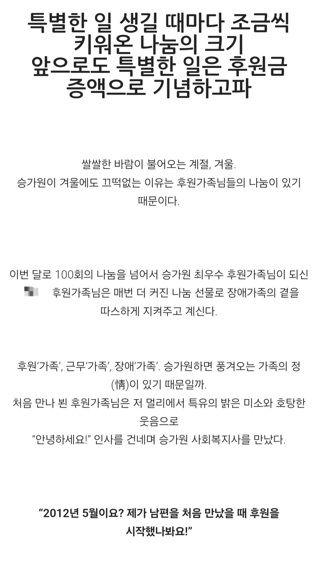 남자친구 그러니까 지금의 내 남편은 내 첫 남자친구다. 내 나이가 그때 24이었으니 첫 연애치고 늦은 편이다. 무척 기뻤었나 보다. 지하철역에 있던 승가원 홍보 부스를 보고 신나게 다가가 최저 금액 5천 원으로 기부를 시작했다. 그때부터 취업, 결혼, 아이출산 등 좋은 일이 있을 때마다 금액을 올려서 지금은 3만 5천 원을 정기 기부 중이다. 복직하면 조금 더 올려야지 싶다.