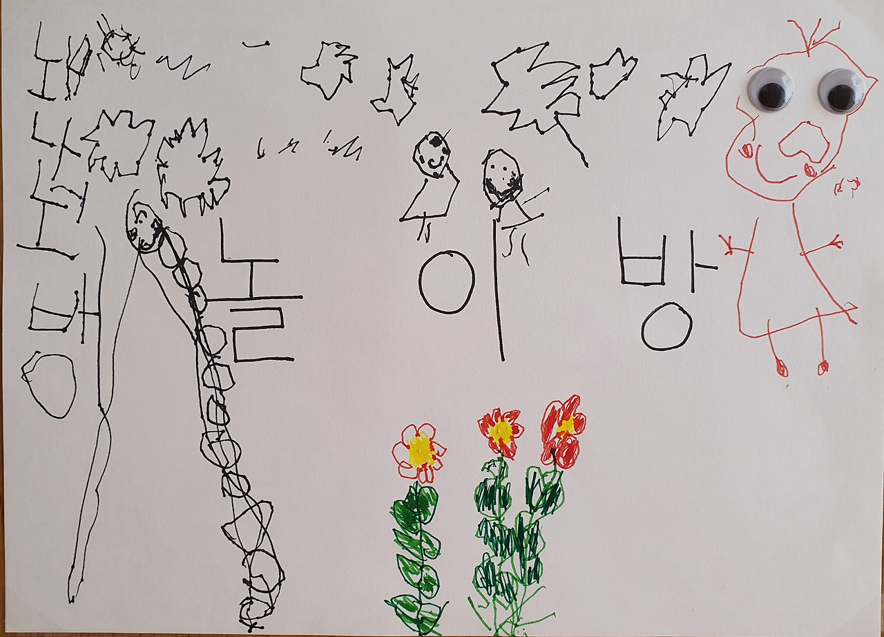 한참을 이것저것 그리면서 왼쪽에는 글씨를 쓰길래 뭐냐고 물어보았더니 '누나들 방' 이란다.