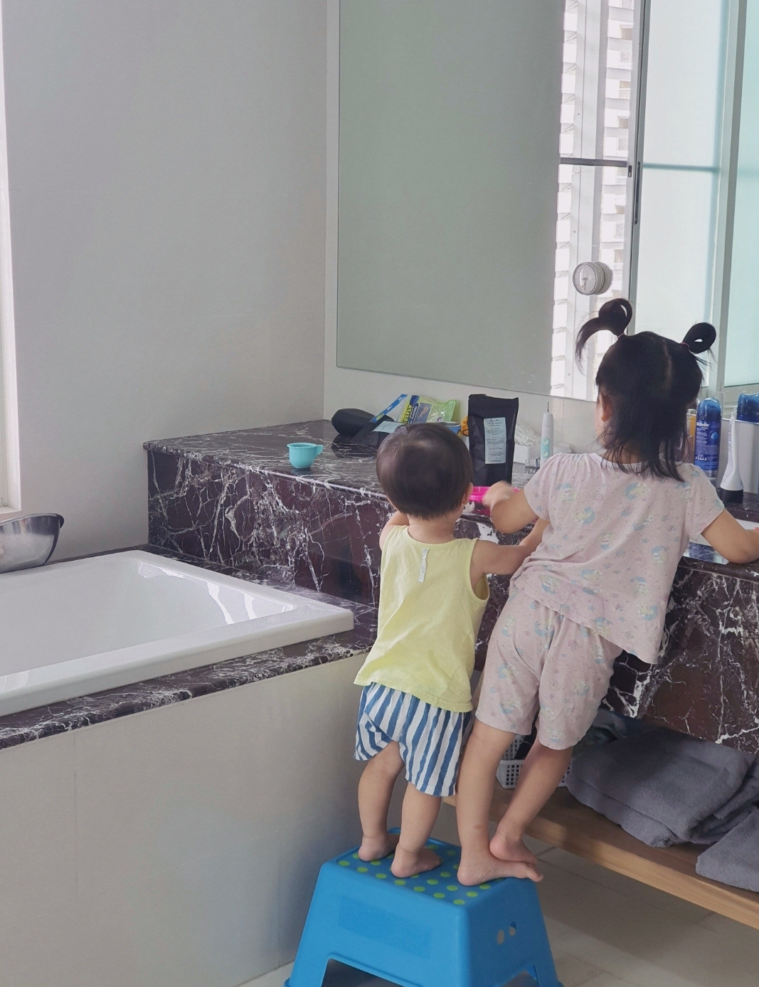 이 주간의 유치원 등원 후 일주일을 쉬다니. 5개월을 셋이서 잘 놀았는데 겨우 이주 동안 편했다고 어떻게 일주일을 보내나 막막했다. 다른 친구에게 옮기면 안 돼서 산책도 아침에 잠깐만 해야 했고 나에게 쉬는 시간을 주었던 물놀이도 못하니 더 그렇게 느꼈다. 더구나 아침 산책시간은 이주 전보다 훨씬 힘들어졌다. 나와 둘이서 유모차 타고 이곳저곳 돌아다니던 둘째가 자꾸 아파트 밖으로 나가려고 해서다.