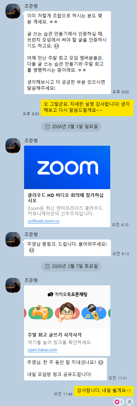매주 일요일 새벽 6시에 zoom에서 만나 각자 글을 쓰고 서로 피드백을 나누는 것. 백수가 되기 전 야근과 주말근무에 시달리는 직장인 좀비로서는 시도해볼 수 없는 호사였다. 그리고 기 빨리게 외출하지 않아도 되고 미리 글을 써야되는 부담도 없다는 게 마음에 쏙 들었다. 글을 놓은 지 오래됐고 아침에 일어나는 것도 자꾸 포기해 온 나에게, 누군가와 함께 글을 쓰며 아침을 여는 이 모임은 마지막 동아줄 같은 존재였다. 구정까지 지나보내면 정말 다시 돌아갈 수 없을 거 같아 이 기회를 꼭 잡고 싶었다. (그 전에 2주 이미 신청해놓고 실패함)