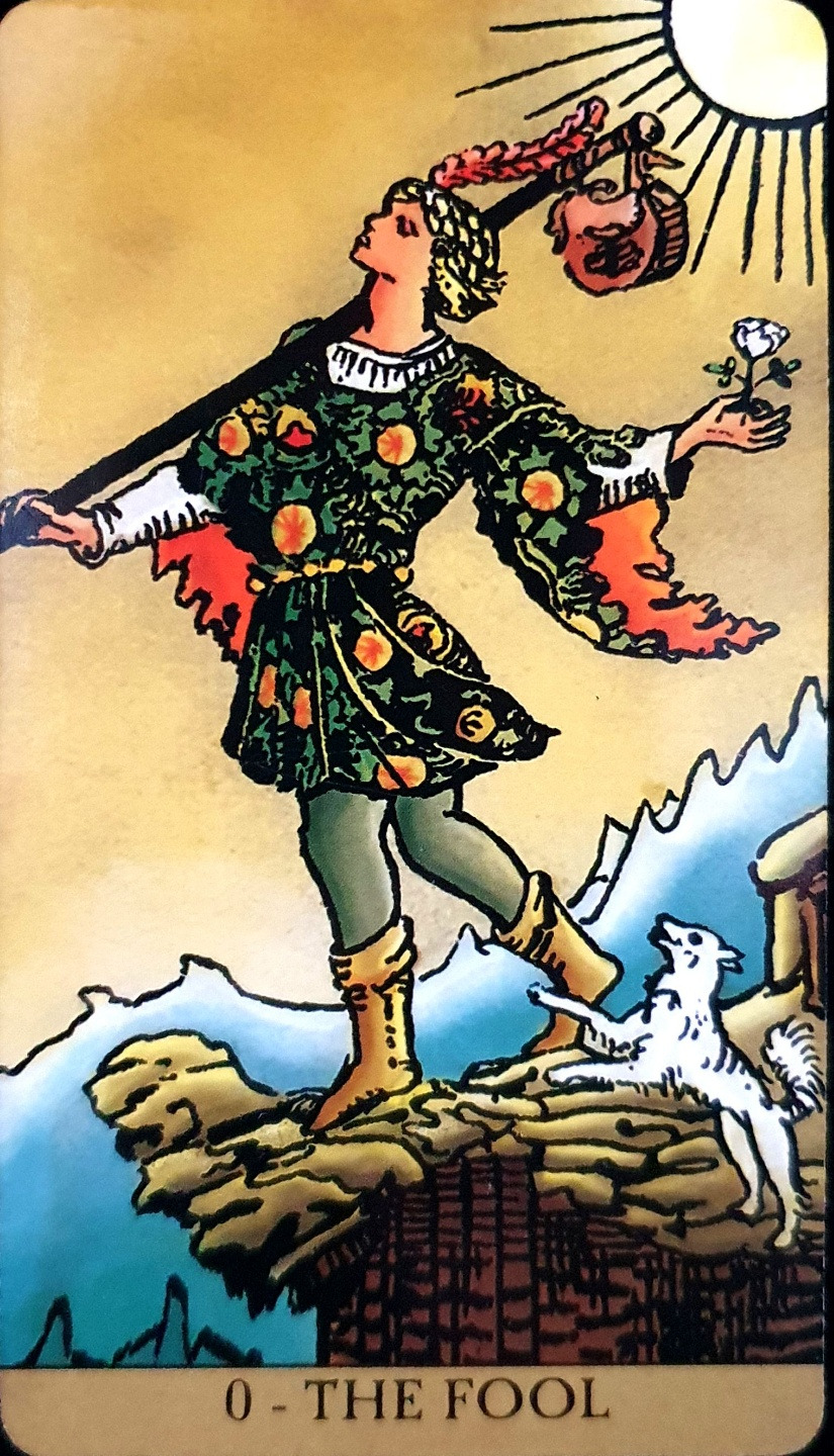 끝을 생각하지 않는 시작. 바보 카드의 인물 또한 그래 보인다. 그의 표정은 한껏 달떠있다. 그 길의 끝에 무엇이 있을지 걱정하지 않는 눈치다. 그는 오직 ‘시작에 대한 기대감’에 부풀어있을 뿐이다. 그의 옷은 그런 그의 마음을 대변하듯 화려하고 밝다. 밝은 노란색의 배경에는 그의 기분이 그대로 반영되어 있다.