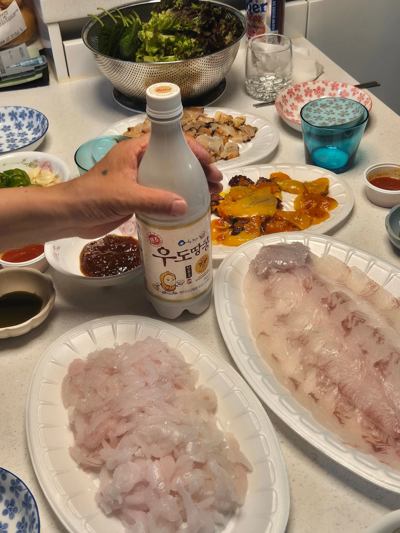 우도를 한 바퀴 돌며 알차게 여행을 즐긴 후, 저녁에는 회를 포장해 와서 숙소에서 맛있게 먹었다.