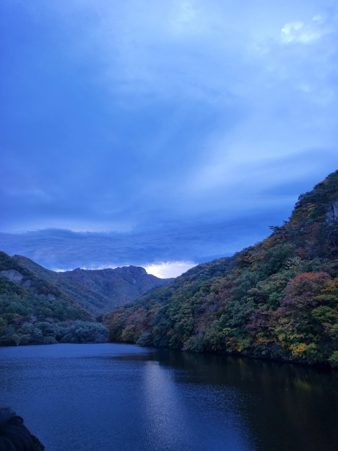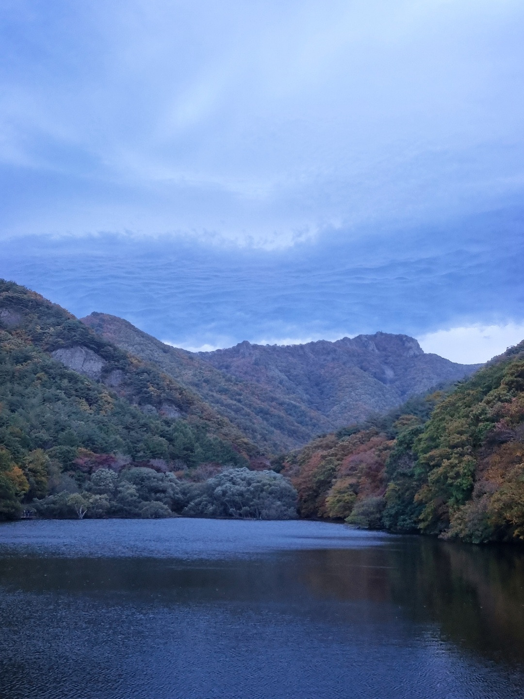 주산지 위를 흘러가는 구름이 여러 겹의 능선을 연출하며 겸재 정선의 밀밀지법(密密之法)을 선보인다.