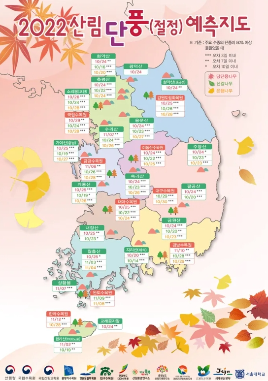 이번 주부터 많은 산들이 단풍 절정이다. 단풍은 벚꽃과는 반대로 북쪽 지역에서 남쪽 지역으로 내려간다. 노랗고 붉어지기 때문에 따뜻한 남쪽 지역부터 단풍이 들거라 생각할 수 있지만 단풍은 기온이 낮을수록, 대개는 일 최저기온이 5℃ 이하로 떨어지면 발생한다(기온이 떨어지면서 잎 속 엽록소 분해로 인해 색소가 화학반응을 일으킴).