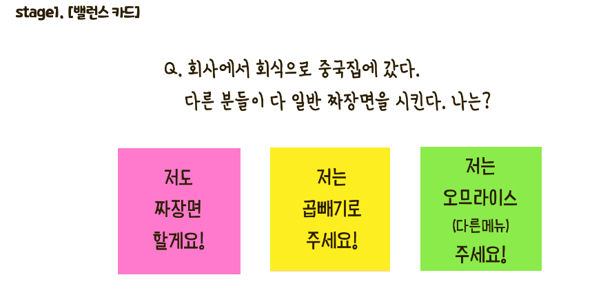 이렇게 회사 생활을 할 때는 본인의 생각과 근거를 장착해야 한다는 메시지를 전달했다.(다시 생각해도 괜찮은 듯) 그리고 교육생과 상호작용하면서 또 다른 메시지를 전달할 수도 있다. 예를 들면, 회식 상황에서 남들과 다른 메뉴를 시킬 것인지를 고르는 상황카드였다. 이것도 내가 만든 상황카드였는데 우리 회사는 메뉴 통일해야 하는 그런 문화가 아님을 보여주려 했던 것이다.