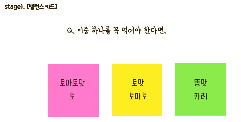 "여러분, 회사생활을 하다 보면 정답이란 게 없을 때가 많아요. 여러 개의 답이 존재할 때가 많죠. 그래서 내가 어떤 결정을 내릴 때는 본인만의 근기를 갖고 주장을 해야 해요. 근거가 있고 그게 타당하고 합리적이라면 여러분의 주장이 정답이 될 수 있는 거죠. 토맛 토마토를 고르신 00님은 왜 이걸 고르셨나요?"