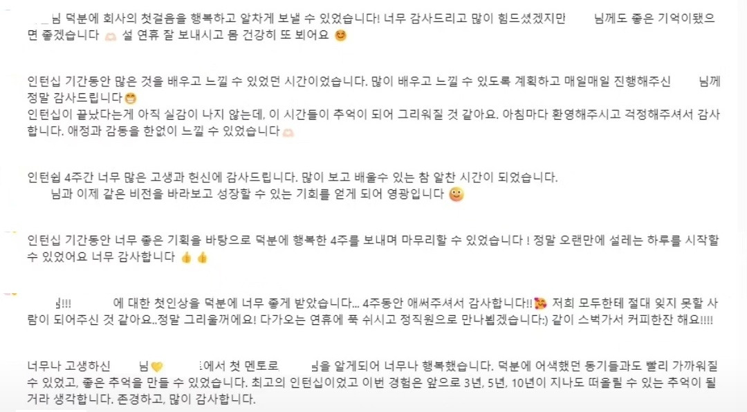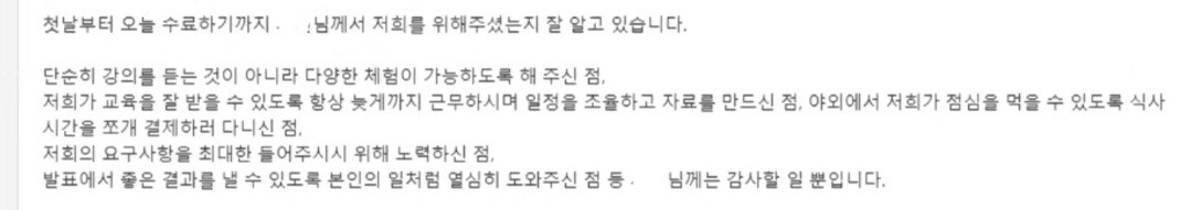 그러한 나의 노력이, 그리고 이들에게 정말 알차고 보람된 시간이 되기를 바라는 나의 진심이 신입 분들에게도 전해졌나 보다. 모든 과정을 마무리하는 수료식 날, 정성으로 눌러쓴 편지와 직접 만든 초콜릿을 전한 신입 분도 계셨고, 메일과 메신저로 고맙다는 연락을 주신 분들도 계셨다. 써주신 코멘트에 눈물이 핑 돌았다. 요즘 정신적 체력적으로 많이 약해져서 눈물이 많아졌는데 이건 기쁨의 눈물이었다. 진정성은 통하는구나. 내가 고생한 보람이 있구나. 많은 것을 희생한 것도 맞지만 얻은 것도 많다. 복합적인 감정에 또 눈물이 났다.