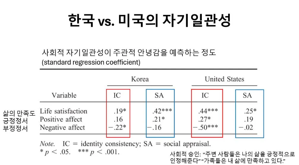 부정적인 정서를 많이 느끼는 사람들도 자기 일관성이 매우 낮음. 자기 일관성의 긍정적인 기능이 우리나라에선 크게 나타나지 않음.