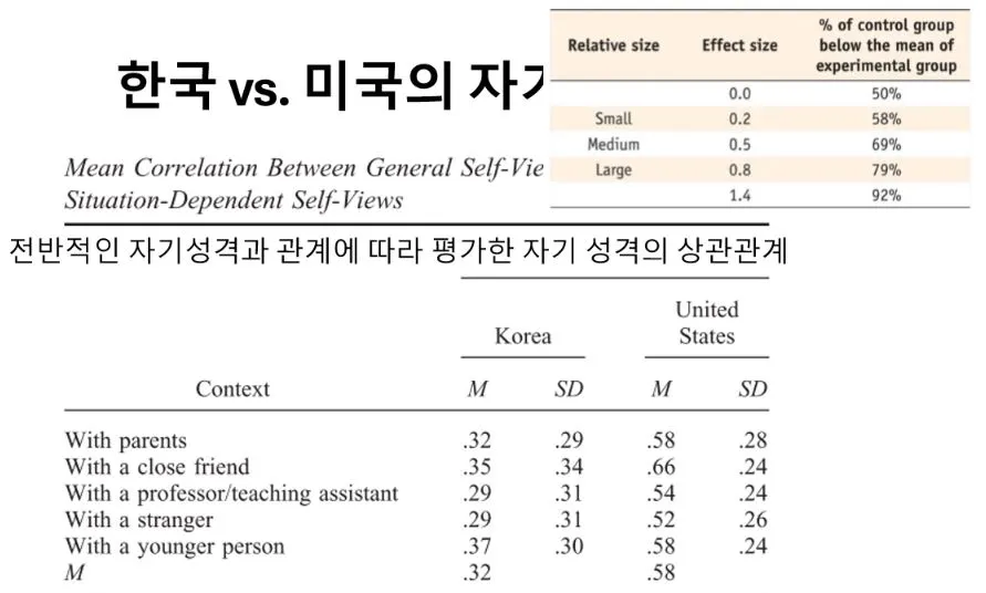 左 : 미국인들은 스스로 생각하는 본인의 모습이 다른 사람과 함께 있을 때 모습과 비슷하다고 봄. 중간인 0.5 이상이니 꽤 안정적으로 일관적인 모습을 유지한다고 볼 수 있다. 한국인들은 상호의존적 자아 개념으로 누구와 있느냐에 따라 다른 성격을 보임.