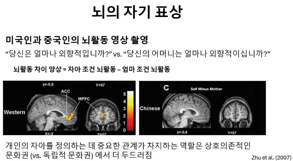 : 뇌의 자기 표상 - 미국인이 본인을 생각할 때는 MPFC(내측전전두엽)가 활성화되고, 엄마를 생각할 때는 ACC (전측대상회 피질)가 활성화됨. -> 뇌가 본인과 엄마를 다르게 인식. 그러나 중국인이 본인을 생각할 때와 엄마를 생각할 때는 똑같은 부위가 활성화됨(나라는 자아개념에 엄마가 포함되어 있음)