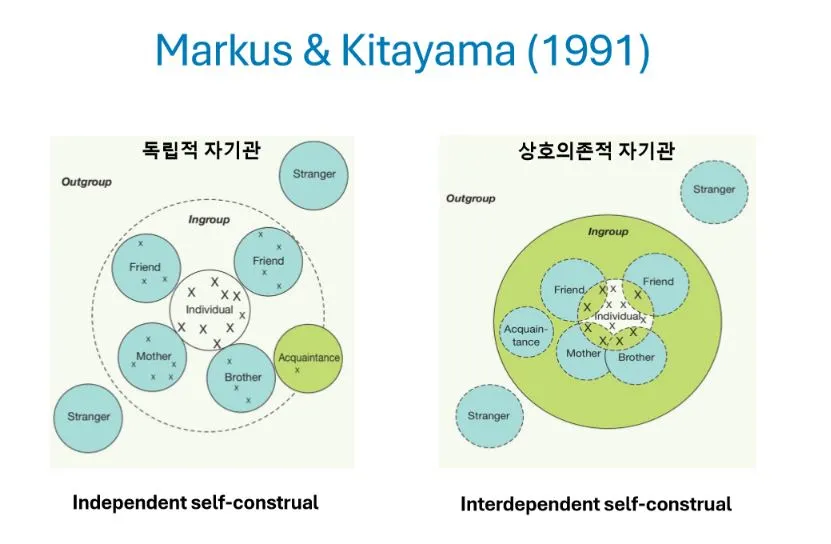 2)상호의존적 자기관interdependent self-construal(비서구권 특징) : 중요한 타인과의 관계에 연결된 정체성, 타인과의 관계에 기반한 정체성, 상황과 관계에 따라 유동적인 자아, 내집단과 외집단의 구분이 명확