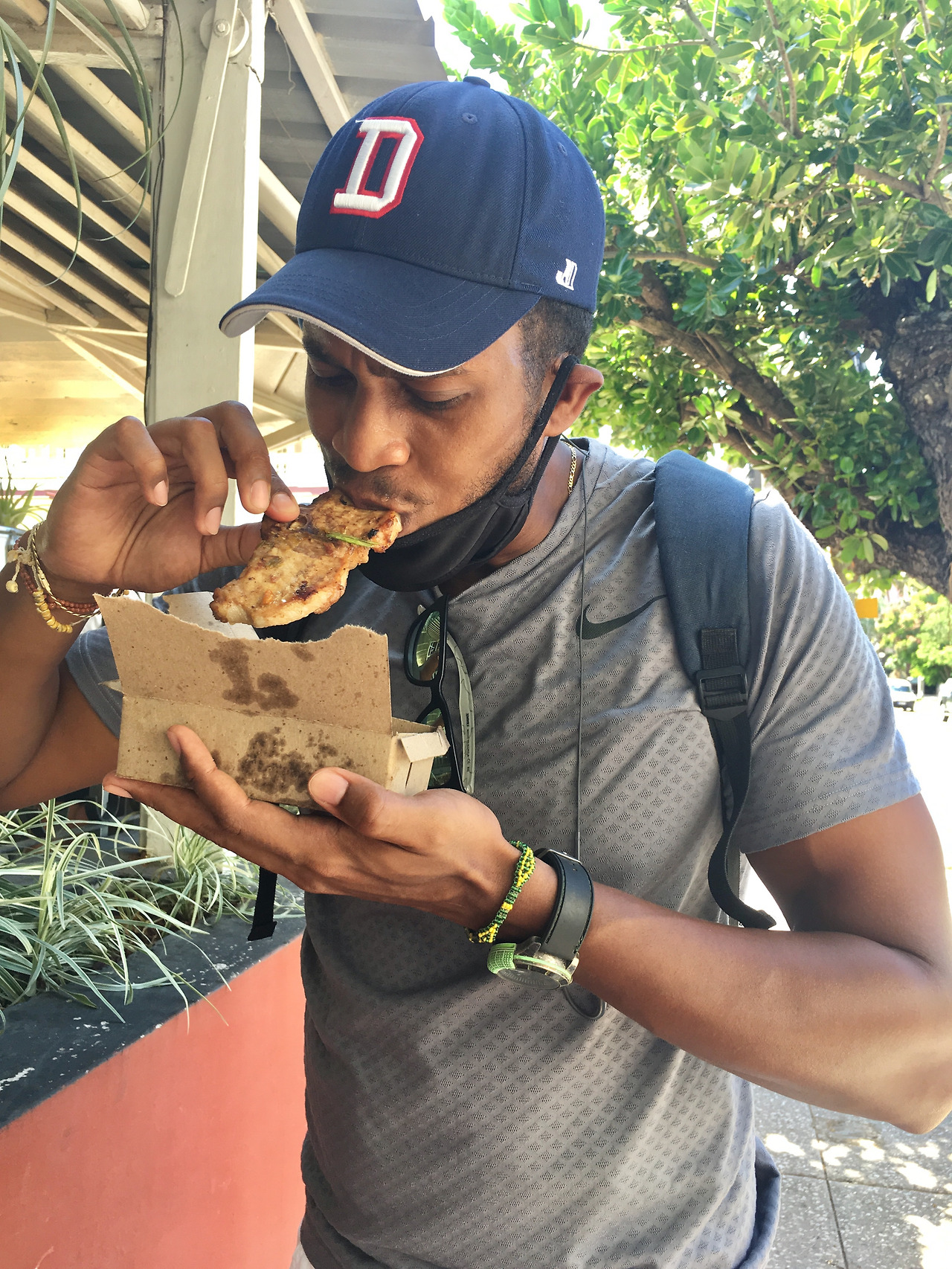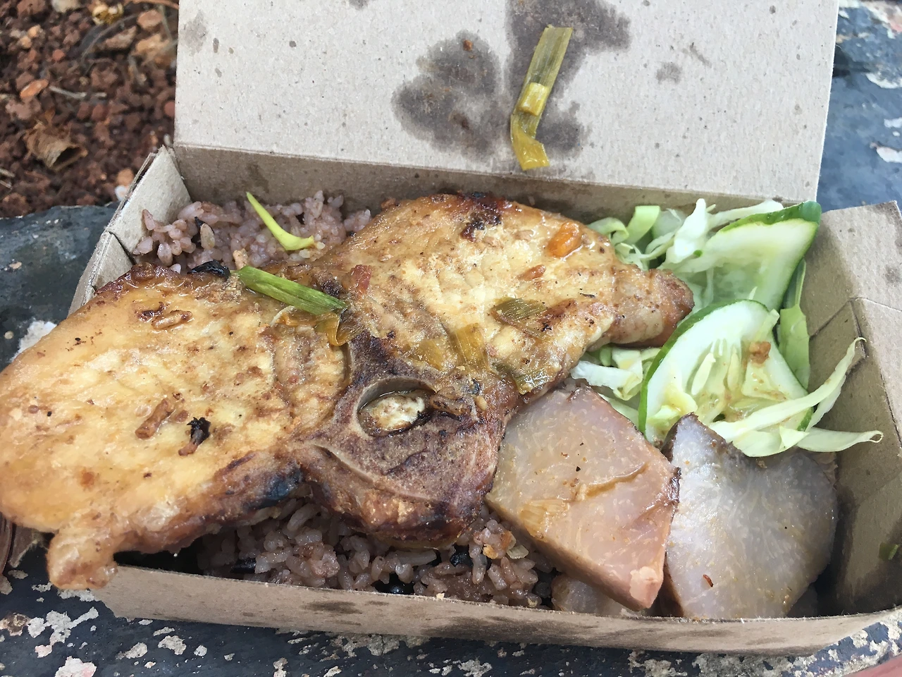 잠시 후 우리 앞에 식당 하나가 나타났다. 코너에 있는 넓은 그 식당에서는 앉아서 먹지는 못하고 상자에 담긴 음식을 사서 가져가서 먹을 수가 있었다. 메뉴는 한 가지, 돼지고기 덮밥이었다. 상자 아래에는 꽁그리(congri)라고 하는 검정콩밥이 담겨있었고 그 위에 출레따(Chuleta)라고 하는 양념된 돼지갈비와 약간의 야채 그리고 고구마 한 덩이가 곁들여져 있는 쿠바의 대중 음식이었다.