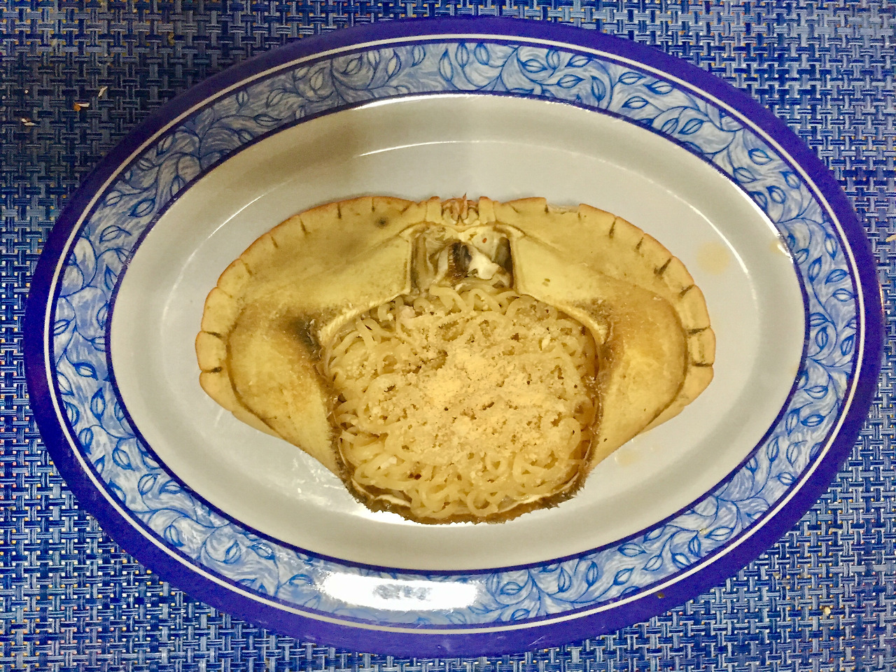 이왕 하는 거 완벽하게 해 보자 싶어서 몇 개 남지 않은 유통기한이 지난 컵라면을 보물 창고에서 꺼내었다. 냄비에 물을 올리고 끓는 물에 게 껍질을 넣었다. 그리고 수프와 면을 넣었다. 게 살이 없어서인지 국물을 푹 끓이지 않아서인지 게 맛은 크게 나지 않았다. 하지만 기분은 좋았다. 뭔가 제대로 하고 있는 느낌이었으니. 신라면의 맵기는 남편에게는 너무 매워서 면만 건져서 밥처럼 게 껍질에 소복이 담아서 주었더니 그 위에 치즈를 뿌려서 아주 잘 먹었다. 남편이 말했다.